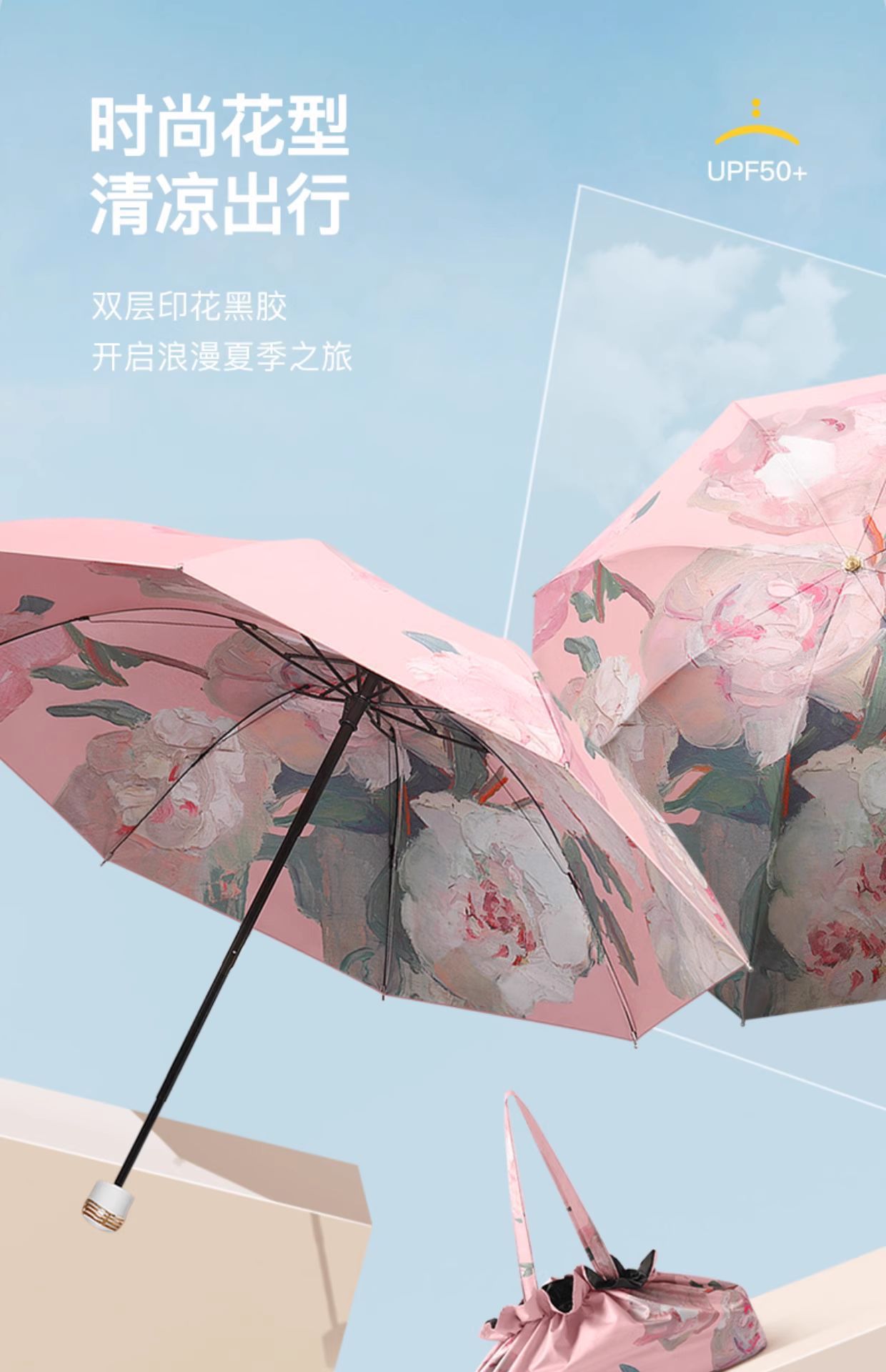five-fold double-layer eight-bone black rubber umbrella (free handbag)-pink peony
