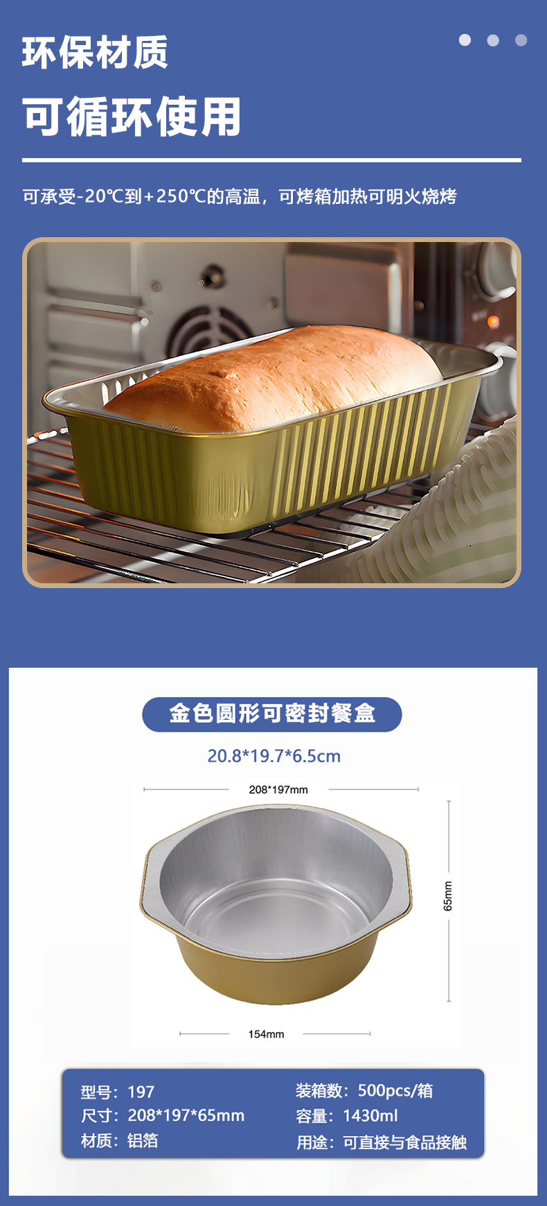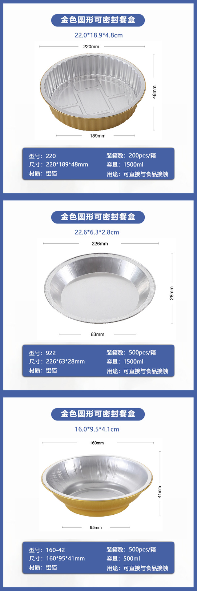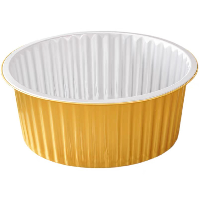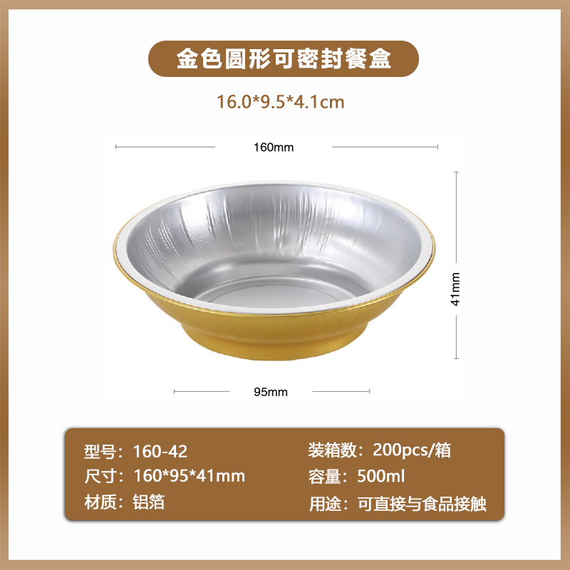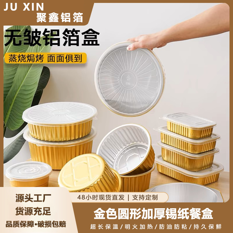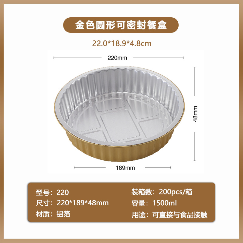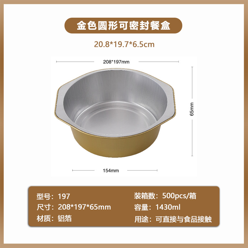golden, round disposable foil to-go box buddha jumps over the wall prefabricated food sealing aluminum foil box commercial grilled shrimp box wholesale 中文版