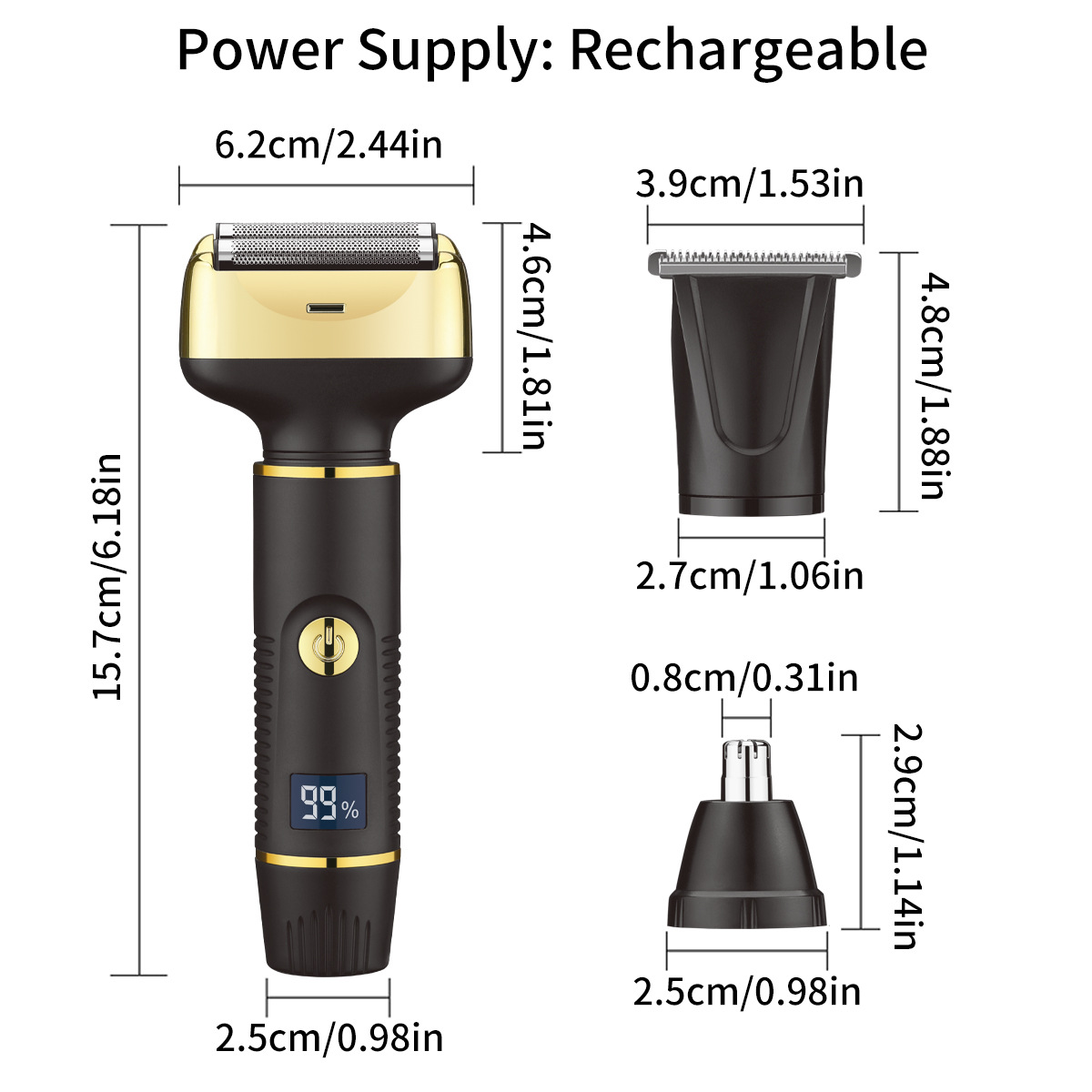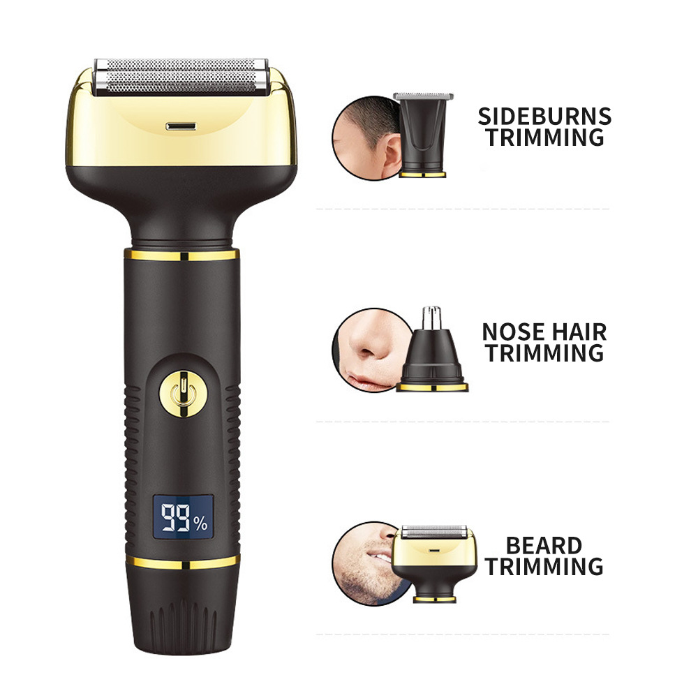 Accessories: main unit, shaving head, hair cutting head, nose hair trimmer head, oil bottle, USB charging cable, hair brush.