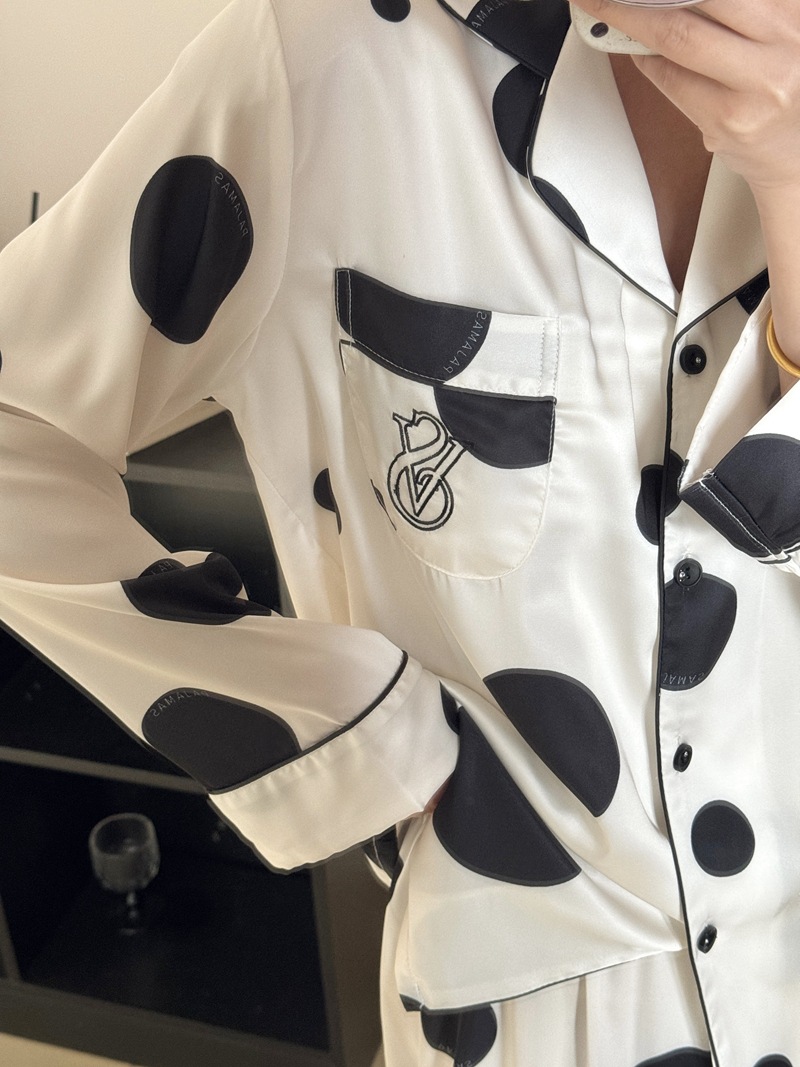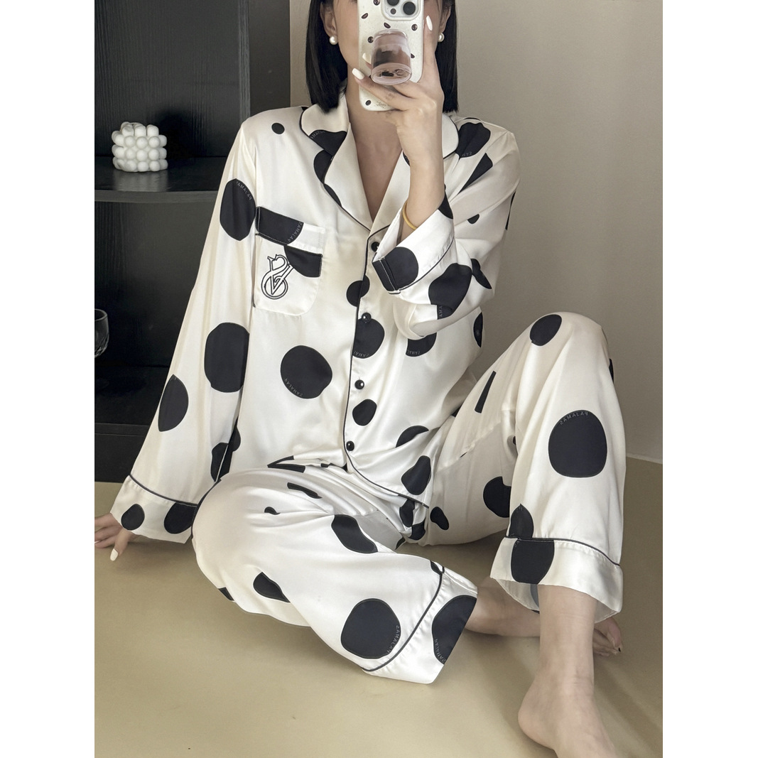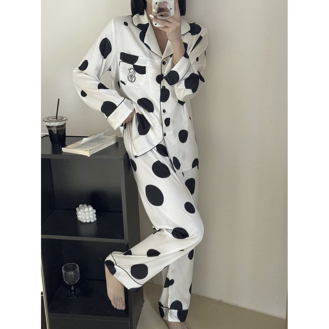 new women's artificial silk polka dot pajamas long-sleeved cardigan fashion polka dot common style home wear suit loose 中文版