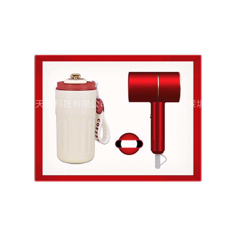 red coffee cup + hair dryer