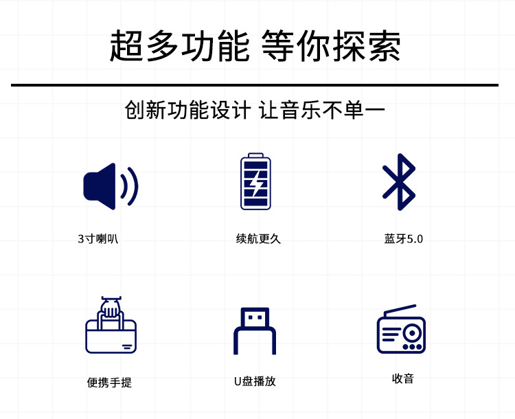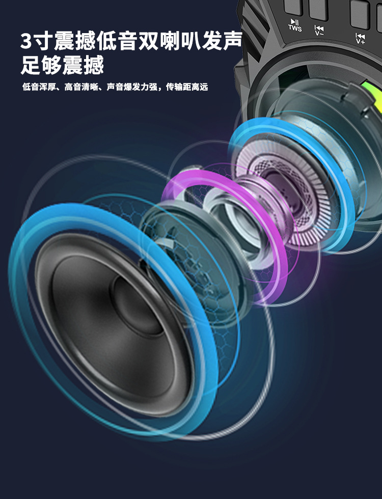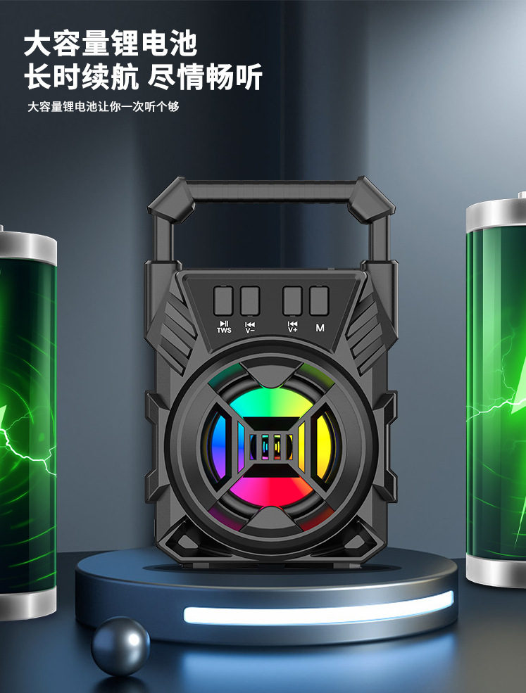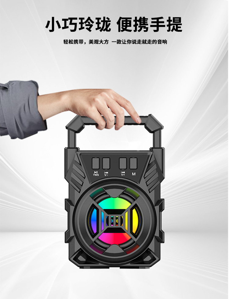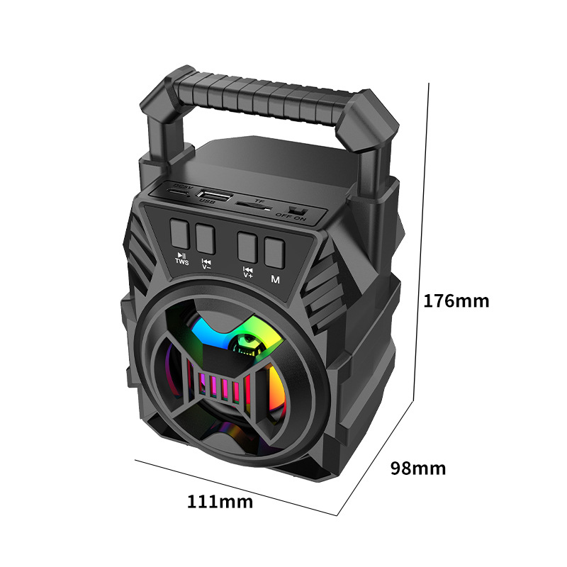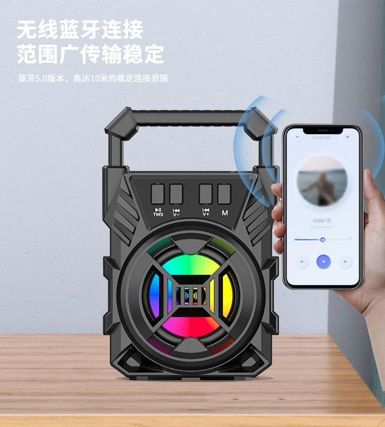 Bluetooth/FM radio/USB/MIC, DC-5V charging. With microphone function, box function, volume control with color LED lights.
