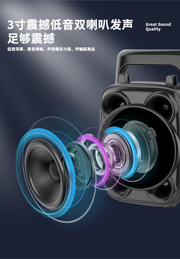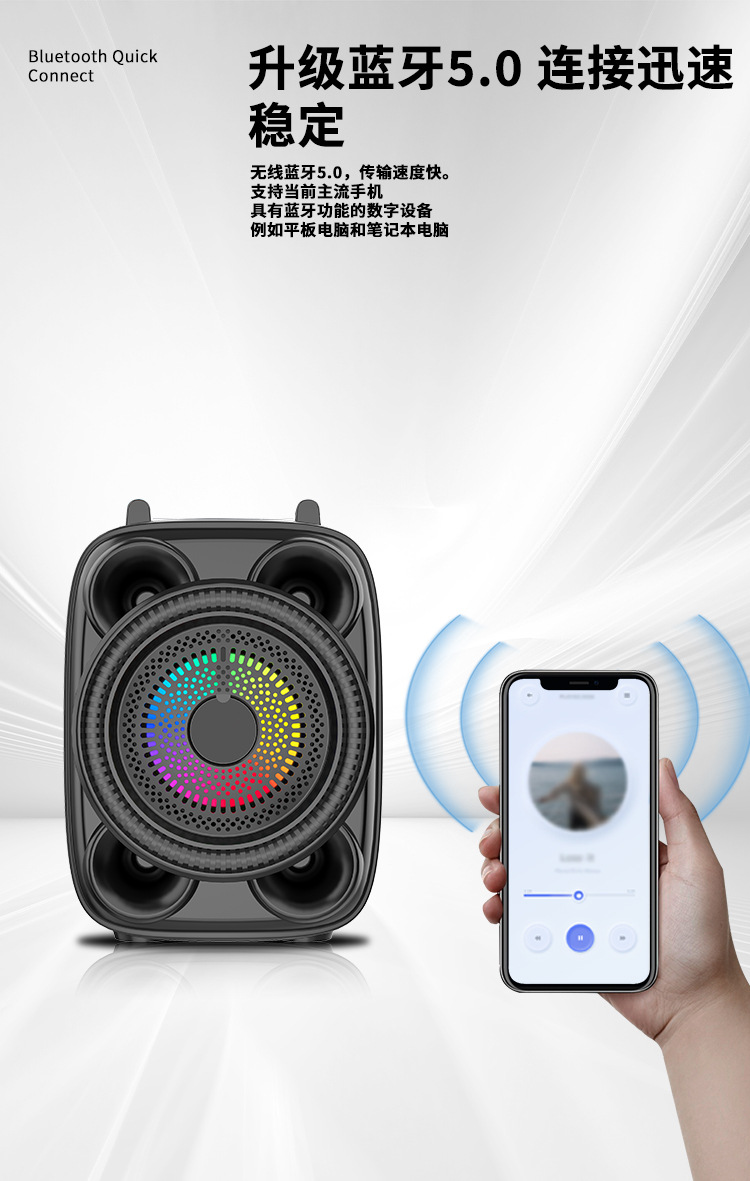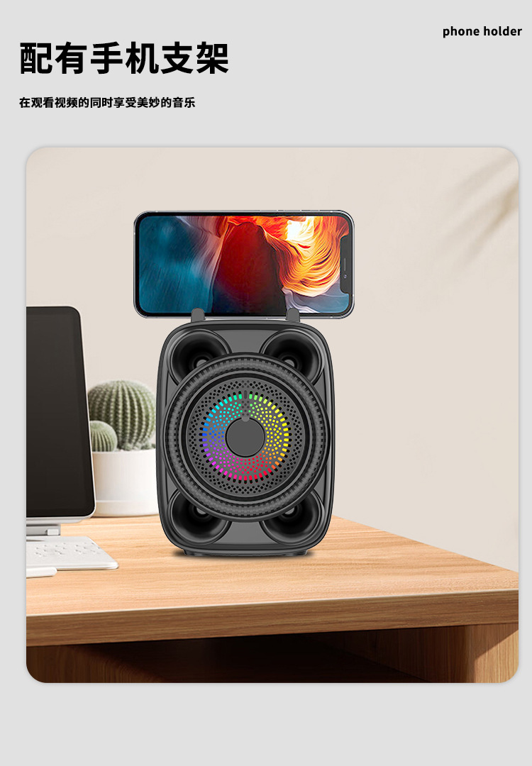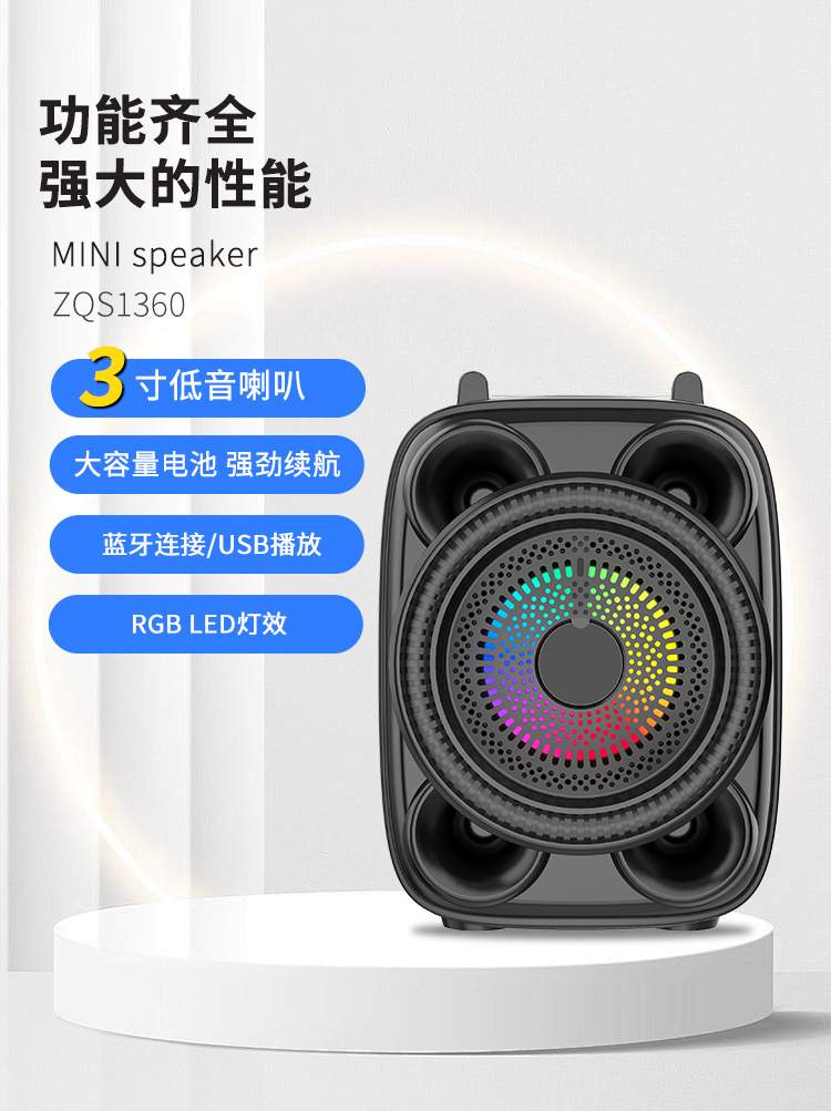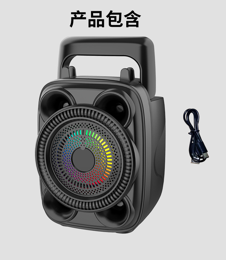 With BT/USB/TF card/FM, DC-5V charging (Type-c port) + Note: FM status (only after plugging in the charging cable can you receive stations) + USB does not boost, mono amplifier, pair box function, button volume + with charging management + with color lights, color lights are controlled by MODE