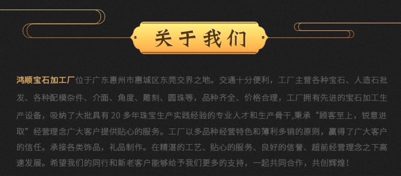 Huizhou Jingyao Industrial Co., Ltd. is located in Huizhou City, Guangdong Province, with very convenient transportation. The company mainly produces various natural gems, synthetic stones, various mold accessories, interfaces, angles, carvings, and round beads. The company has advanced gem processing production equipment and has attracted a large number of professionals with more than 20 years of experience in the production of jewelry. Adhering to the business philosophy of "customer first, forward-looking and enterprising", the company adheres to the principle of "customer first" to provide high-quality services for our customers. The company is developing at a high speed under its exquisite craftsmanship, high-quality service, good reputation, and forward-looking business concept. We hope that our colleagues, new and old customers can give us more support, and work together to create a brilliant future!