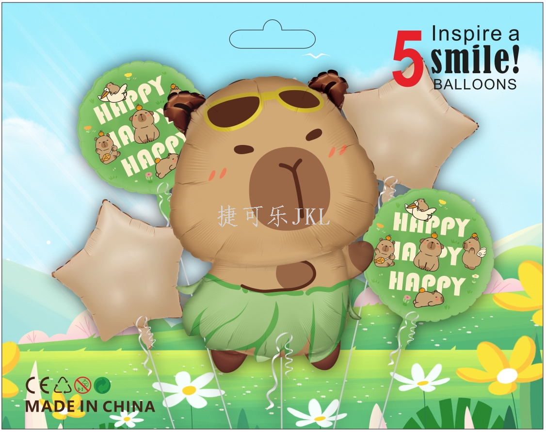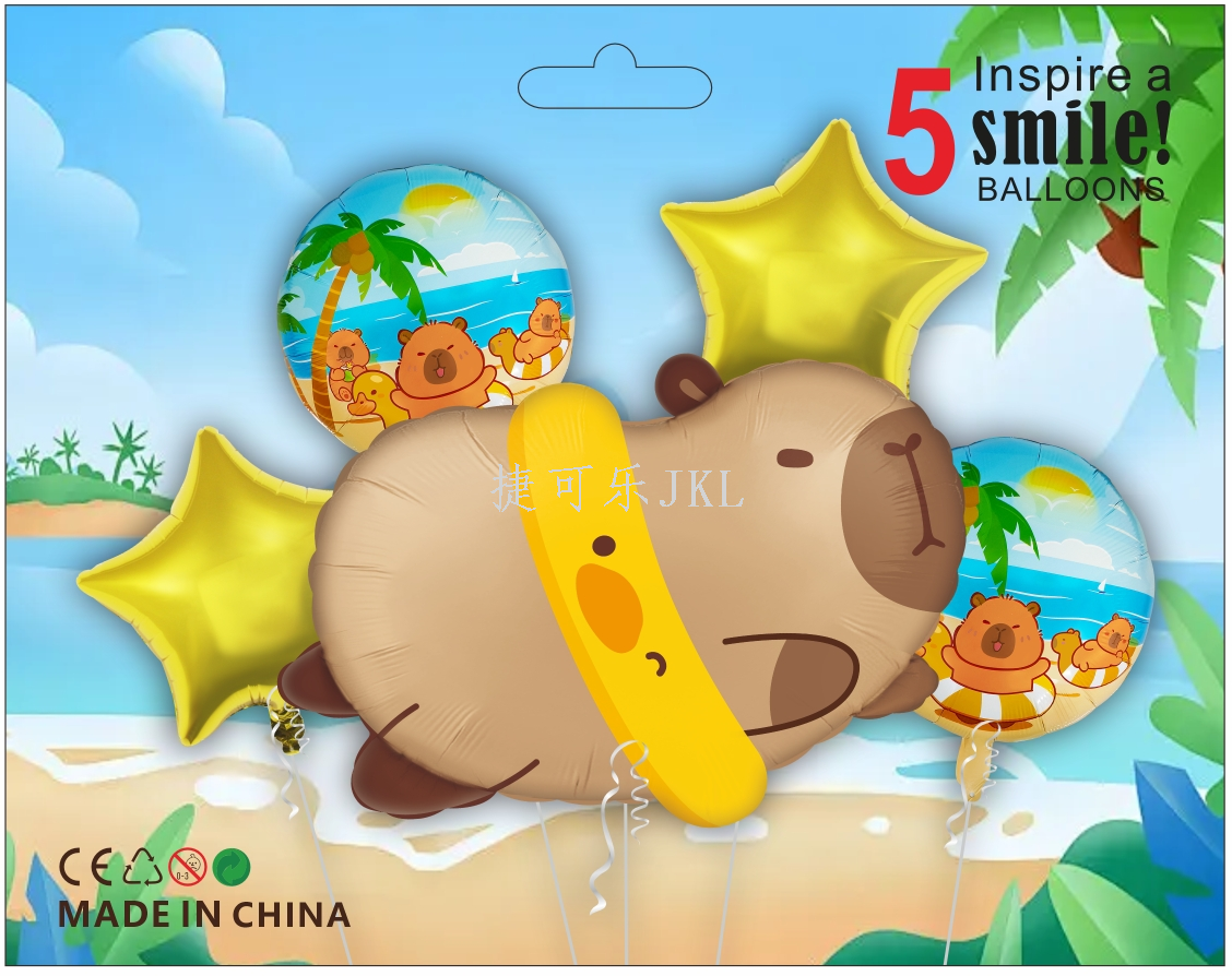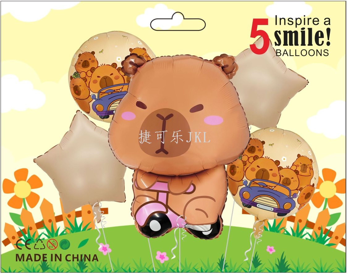 铝膜气球5件套包装,卡通形状卡皮巴拉款式,专为派对、庆典设计,增添无限欢乐氛围。产品采用环保铝膜材质,色彩鲜艳持久,不易漏气。核心卖点包括:各种不同设计的卡皮巴拉卡通形状气球,满足多样化装饰需求;高弹性铝膜材质,确保气球饱满立体;解决用户痛点:无需专业技巧,轻松打造完美派对装饰;让每一次庆祝都成为美好回忆。选择我们的铝膜气球,让卡皮巴拉的可爱形象陪伴您和家人的每一个快乐时刻,创造温馨回忆。