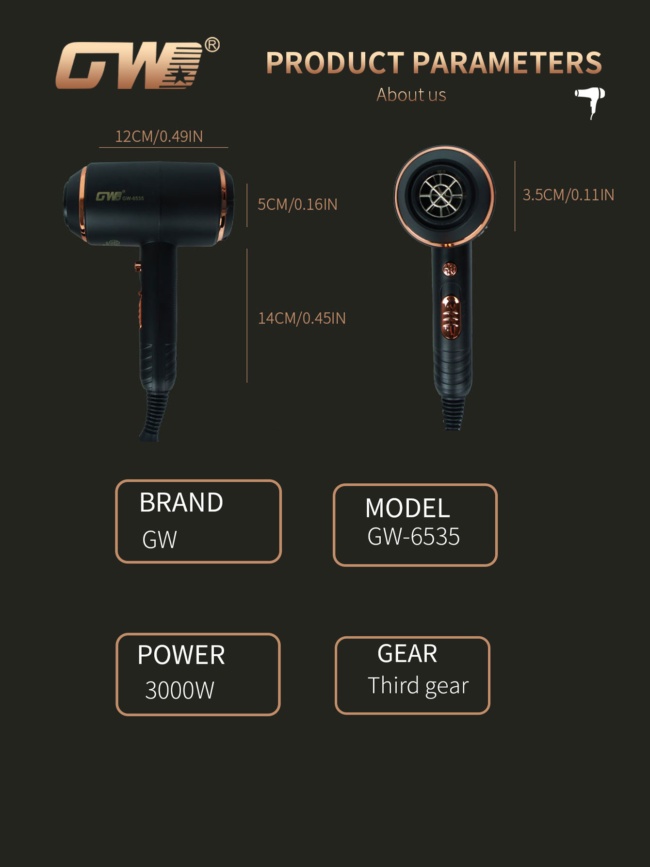 [quick hair drying] it adopts 3000w high power and is matched with high-speed motor to dry hair quickly to reduce thermal damage. built-in negative ion generator neutralizes static electricity, reduces frizz and makes hair smoother. ergonomic design, lightweight body, long time use not tired hands. voltage: 110v-220v power: 3000w frequency: 50/60hz box size: 25*27.5*10.5 box gauge: 52*51*58 gross weight: 21.6 net weight: 20