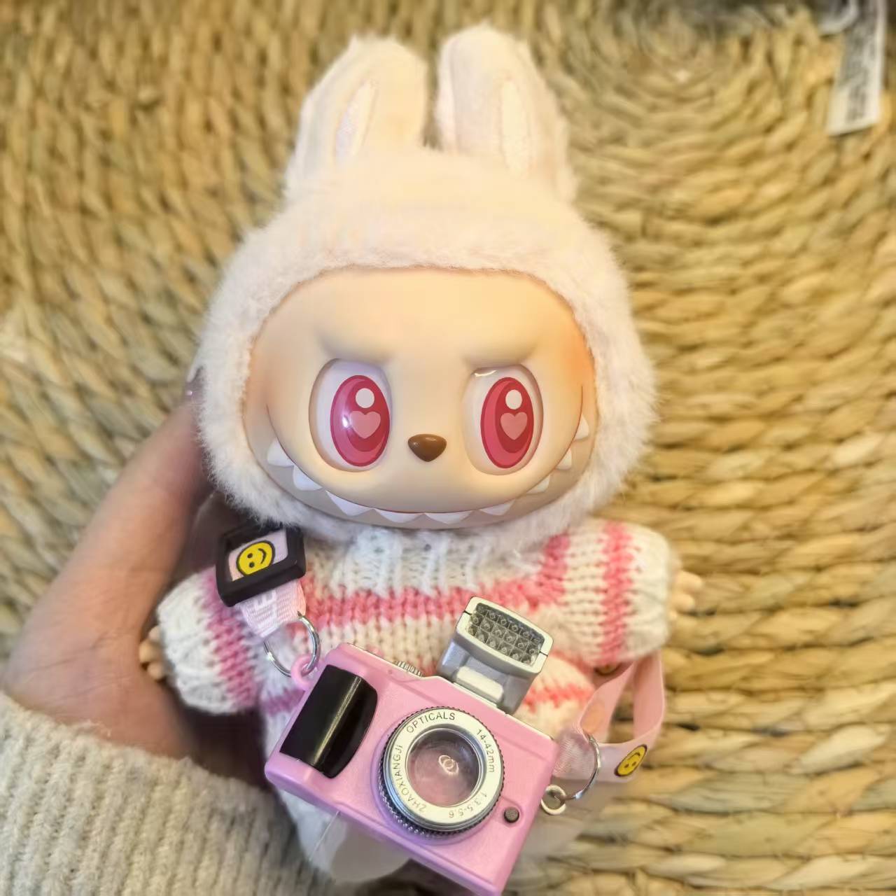 white brushed hat + pink white sweater + pink camera