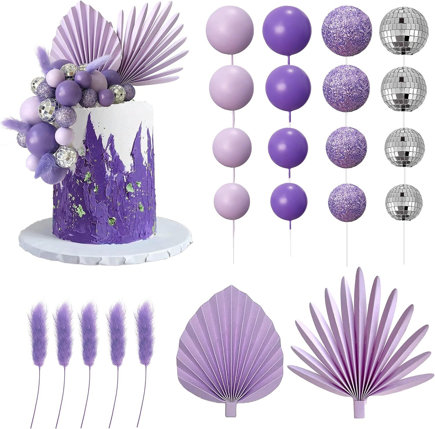 purple cake inserting card suit paper fan foam ball disco ball baking decoration girl birthday party decoration 中文版