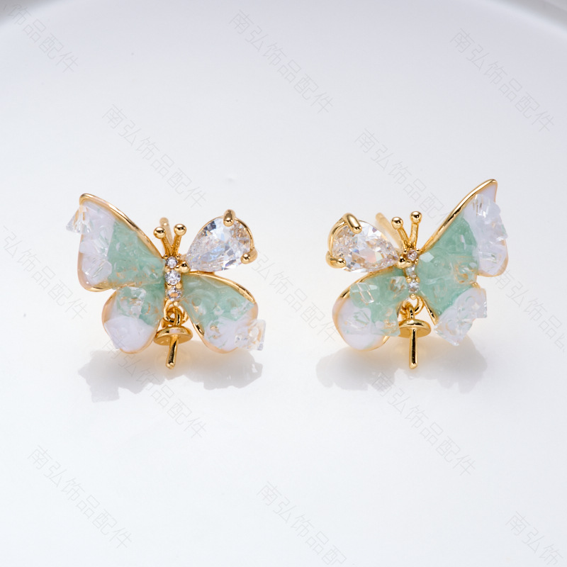 #1762 18k gold green white butterfly stud earrings pair