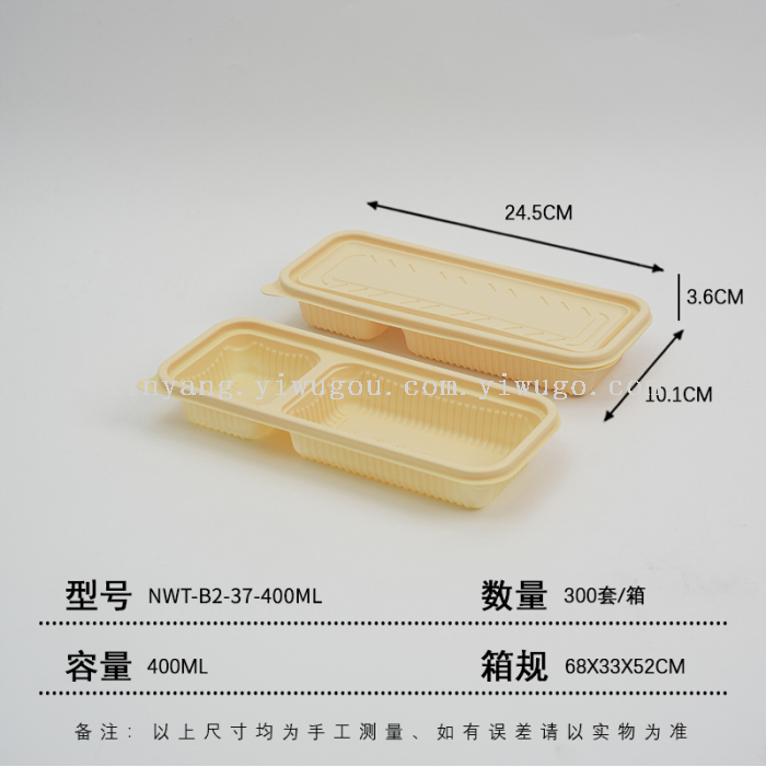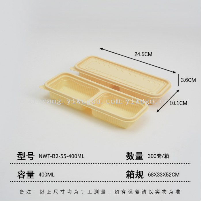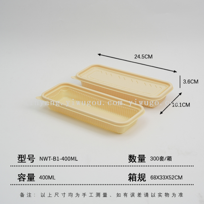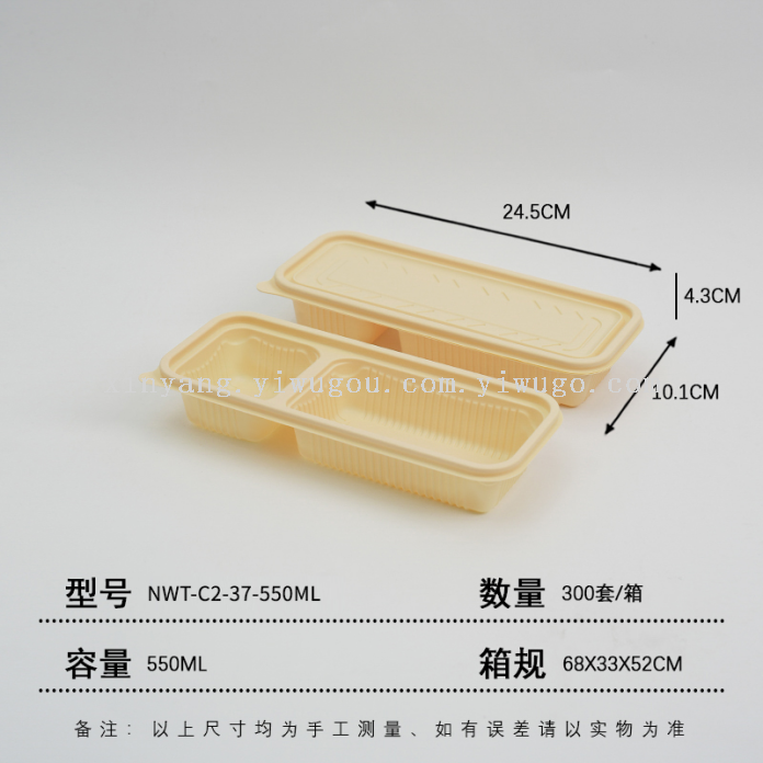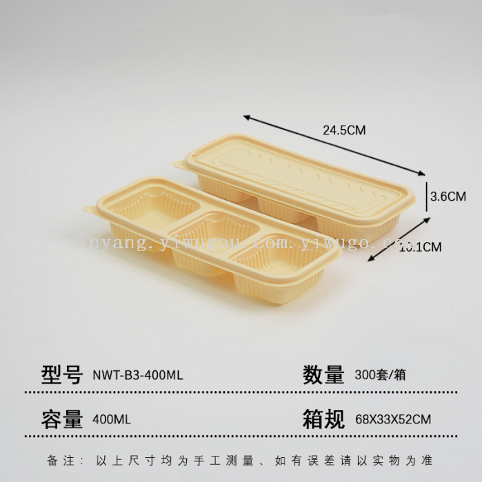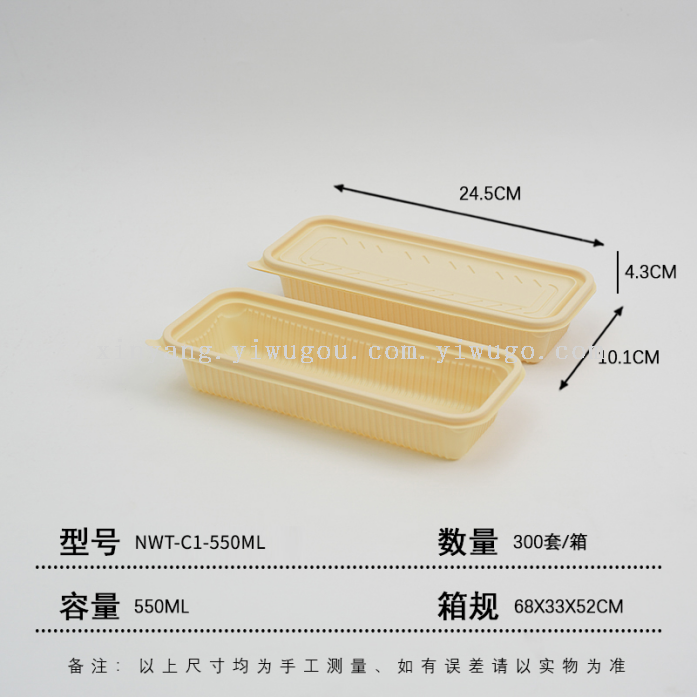 The lunch boxes are made of eco-friendly materials, corn starch, which are biodegradable in natural environments through microorganisms and enzymes. They are heat-resistant, refrigeratable, and have a seal to prevent leakage and contact with food.