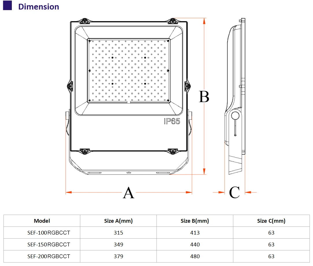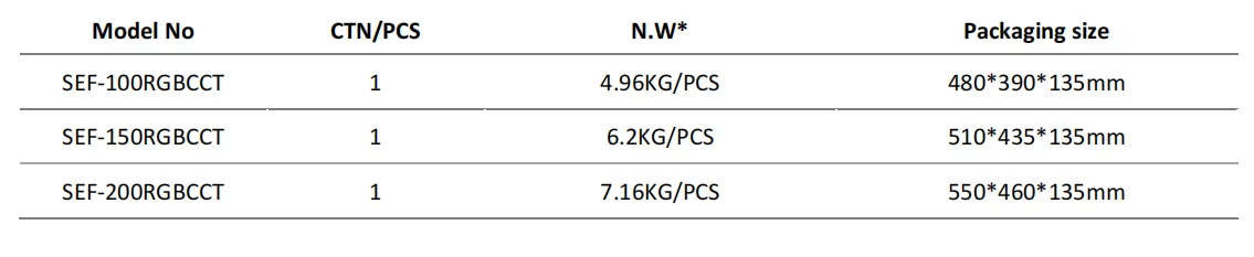 Model Number | SEF-100RGBCCT | SEF-150RGBCCT | SEF-200RGBCCT | SEF-300RGBCCT | SEF-450RGBCCT | ||||