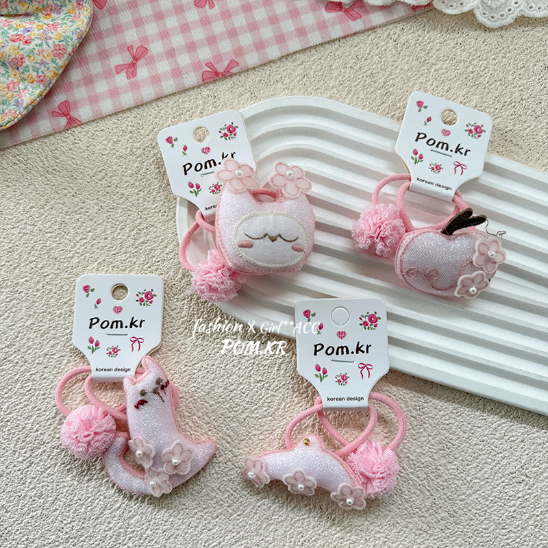 korean children's spring new style pink lace embroidery cartoon hair band girl's cute rubber band tie hair card