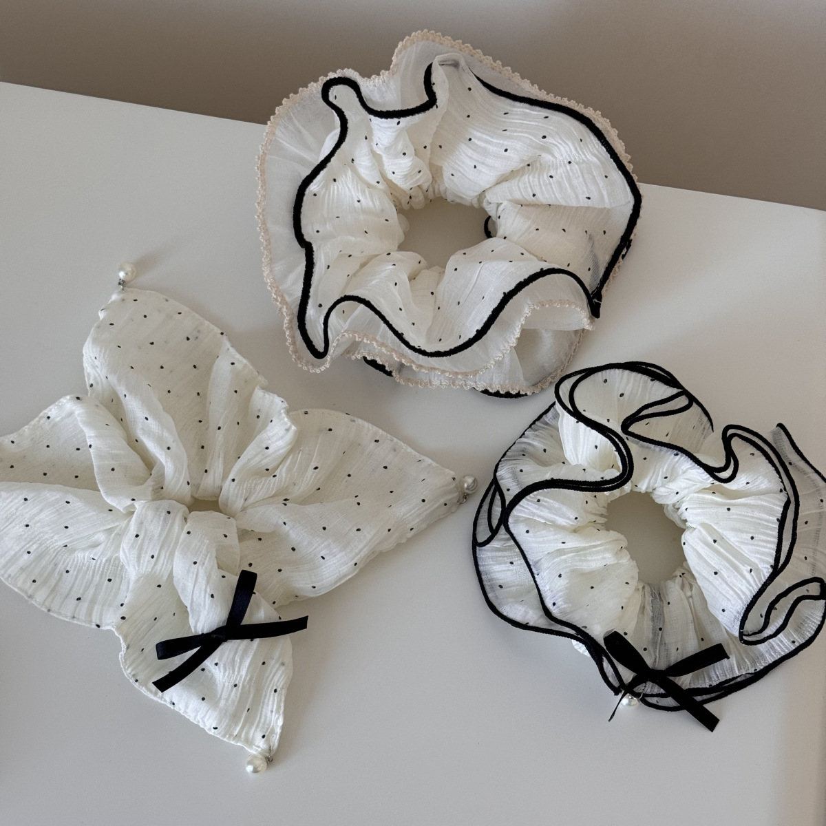 white yarn polka dot-black knot square ring