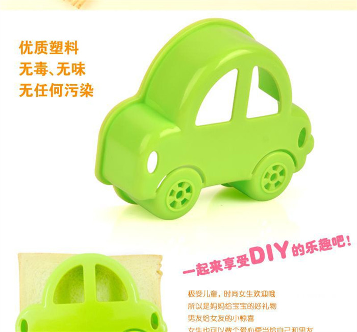 Baby Description: With just a few clicks, you can make little car-shaped sandwiches with various fillings, providing your family with safe, additive-free, and healthy food. Whether it's a snack for your child to take to school on a trip to the countryside, or a nutritious lunch for your workday, this sandwich maker can be put to good use. Are you still at a loss when your child's favorite fillings, such as vegetables, fruits, and meat, fall to the ground when making sandwiches? With this sandwich maker, you can tightly seal your favorite fillings inside the bread. The ultra-humanized design makes it easy to take home. Hurry up and order it! Preparation Method: 1. First heat both slices of bread in the microwave oven for about 15 seconds at medium-high power (Note: approximately 20-30 seconds for a 500W microwave oven). Tip: Toast the bread in the microwave at medium-high power for about 15 seconds. Remember, do not let the time exceed this, as the bread will become softer and easier to handle! bread fillingYou can choose your favorite flavor, and the following can be used as a reference: Sauce category: various jams, honey, salad dressing, tomato sauce, old Beijing sauce, etc. Finished fillings: Korean pickles, homemade tomato and egg, green pepper and pork, minced meat and carrot, corn and ham, etc. Other fillings: bean paste, black sesame paste, etc. Warm Tip: The filling options are varied, ranging from sweet to sour, bitter, spicy, and salty. The filling should not be too much, as the pies are not very large to begin with. The packaging has pictures to show the designs, and they are generally easy to understand. (The middle text mold on the car in the picture is not included; you need to DIY if you want it. The picture shows that the chocolate powder is sprinkled on. We sell it in our store.)