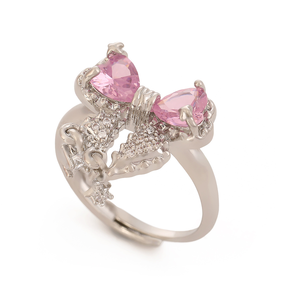 pink love heart bow tie ring silver