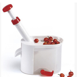 3. Simply press the handle on the socket, and the stainless steel blade inside will pierce the cherry, pushing the pit into the cup body. Then, with a gentle backward motion of the whole pit remover, the pit-removed cherries will roll out of the hole into the bowl that has been set aside.
