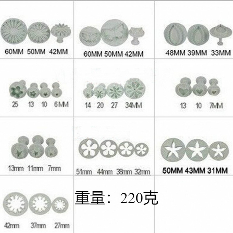 Product Name: 10-piece (33pcs) Sugarpaste Tool Kit Material: Food-grade plastic ABS, compliant with FDA and LFGB standards. Weight: 220 grams The dimensions and weight are approximately... Packing: Plastic bag packaging Function: Sugar Paste Cake Decorating Pressed Flower Modeling 3pcs sunflowers, 3pcs butterflies, 3pcs rose leaves, 4pcs plum blossoms, 4pcs daisies, 3pcs stars, 3pcs heart shapes, 4pcs roses, 3pcs carnations, 3pcs hollow calyxes Function: Sugar Paste Cake Decorating Pressed Flower Modeling Description: Sugar Flowers Carving Tools, Sugar Flower Modeling Tools, Sugar Tools, Baking Tools, Baking Wholesale Mainly engaged in baking tools, baking equipment, sugar painting tools, sugar flower molds, cookie molds, pineapple molds, shortbread molds, pastry bags, pastry tips, rolling knives, brushes, measuring spoons, measuring cups, cake saws, turntables, rolling pins, heat-resistant gloves, scrapers, flour sieve, whisk, kiss cutters, spreaders, cake molds, mousse rings, chocolate molds, cake racks and other baking tools.
