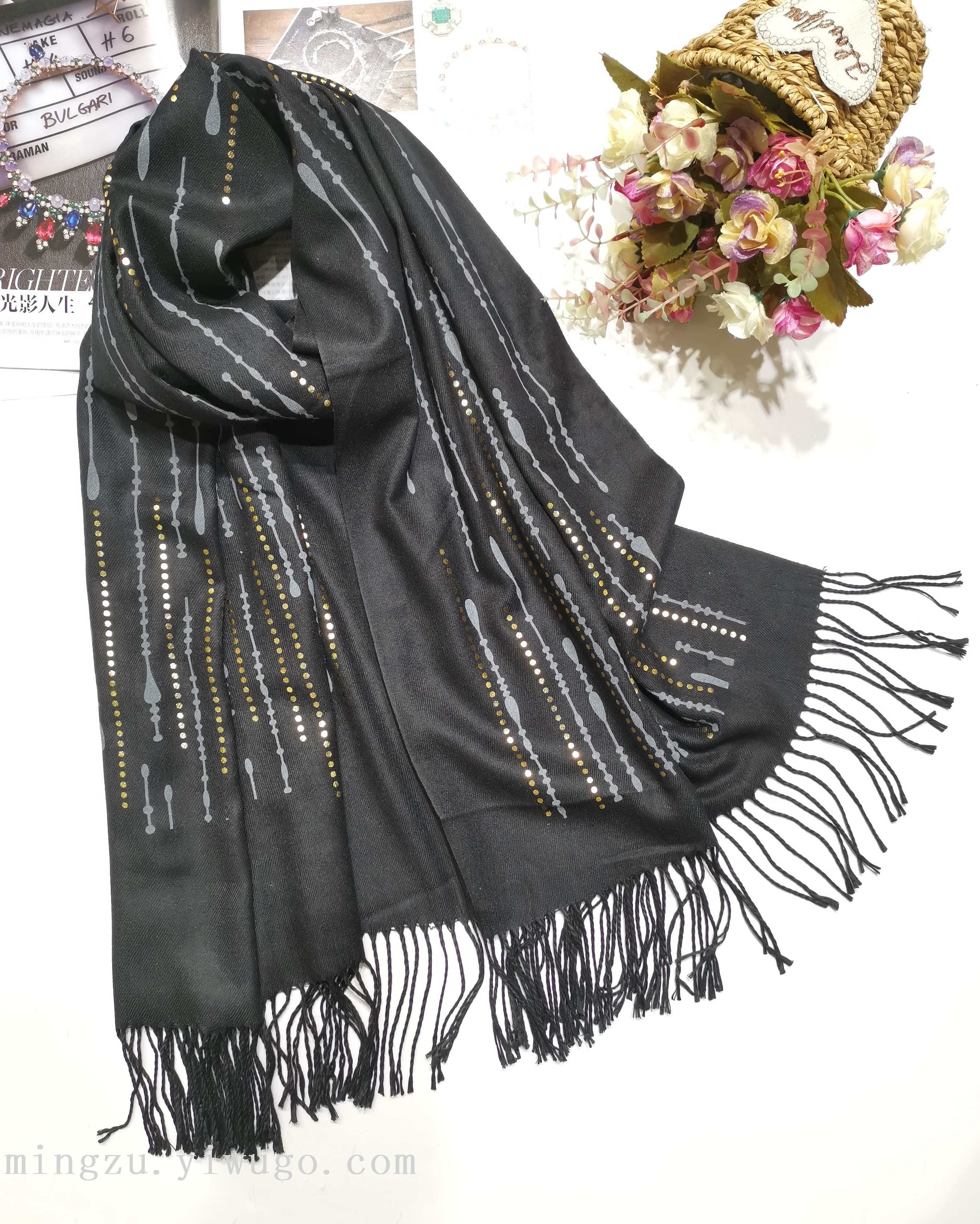 best-selling foreign trade digital printing double-sided scarf bronzing scarf water drop women's long scarf elegant tassel shawl