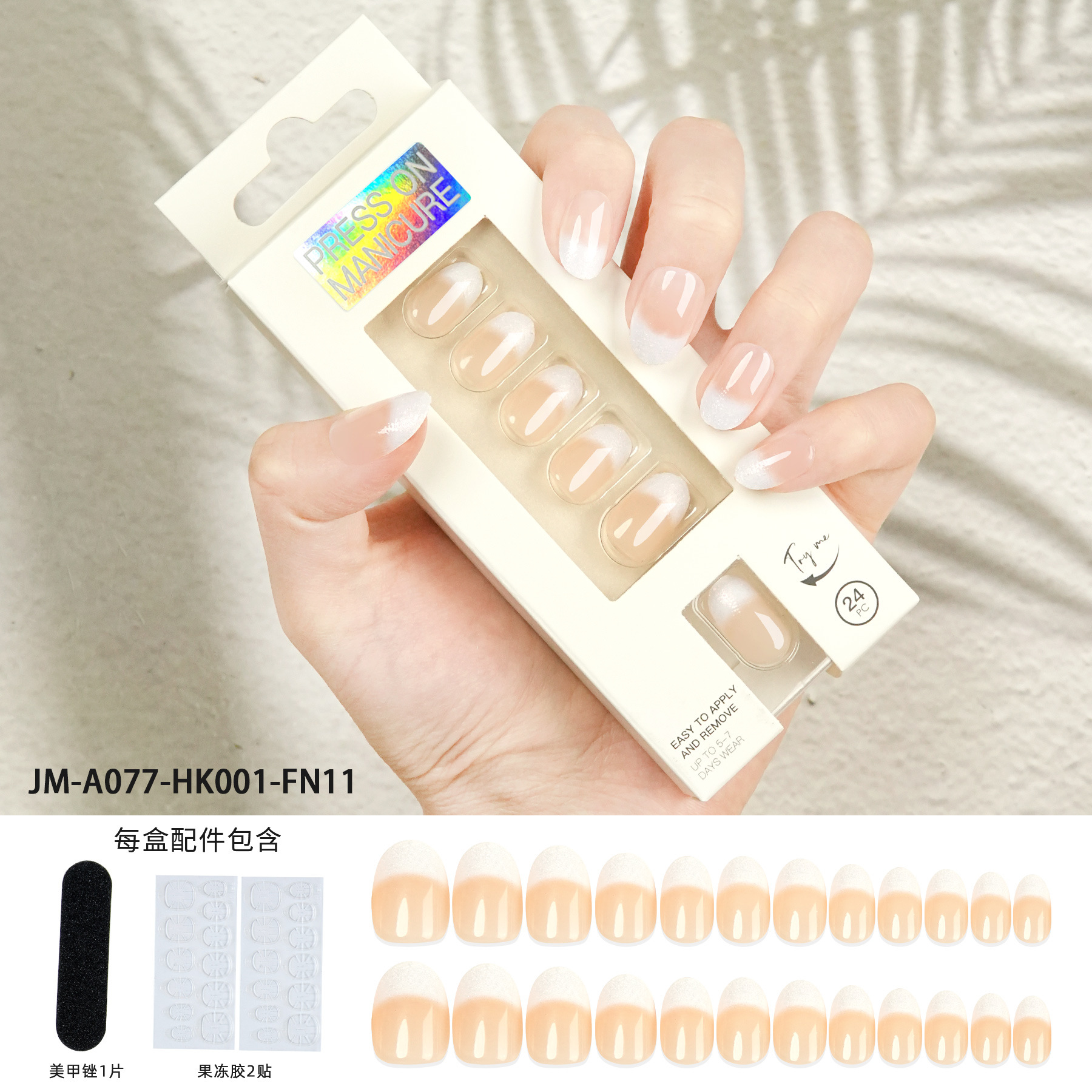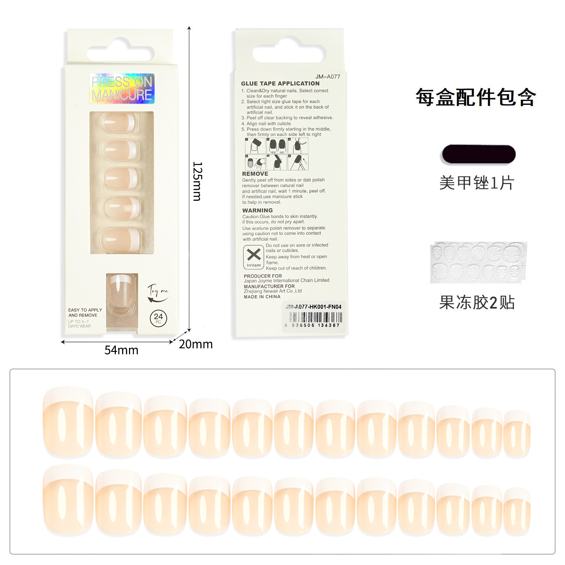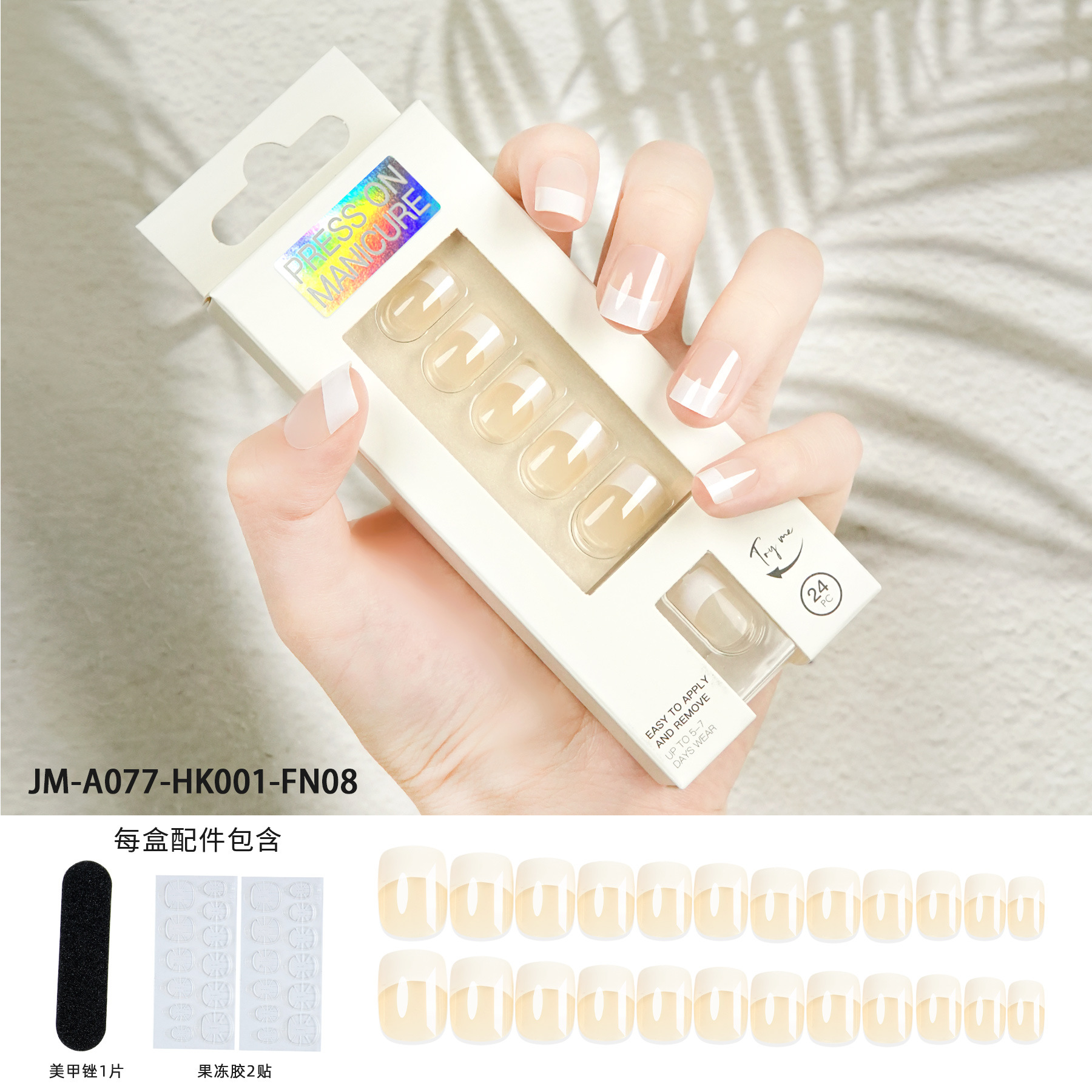 【Packing Method】24 pieces of nails + 2 pieces of backing tape + 1 grinding file Single box size: 14.5*5.3*2CM Single box weight: 25g
