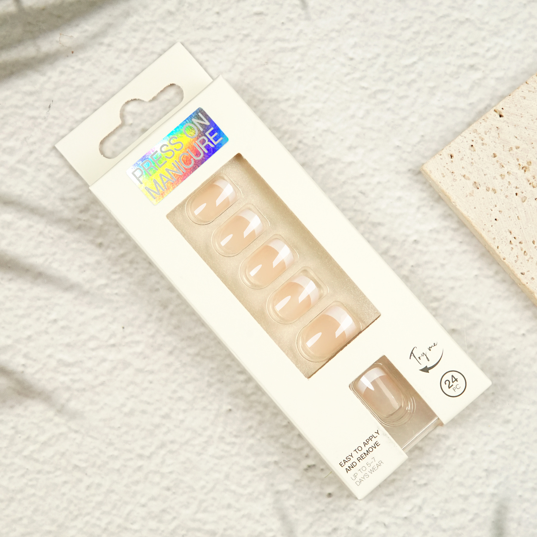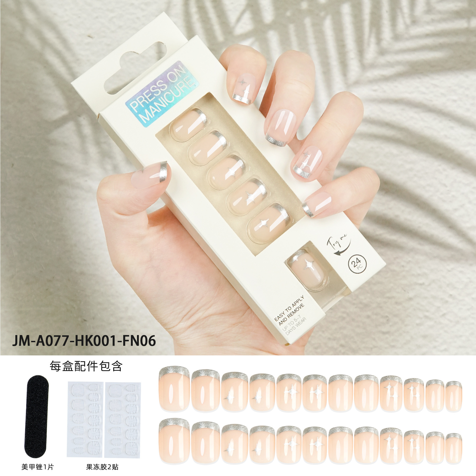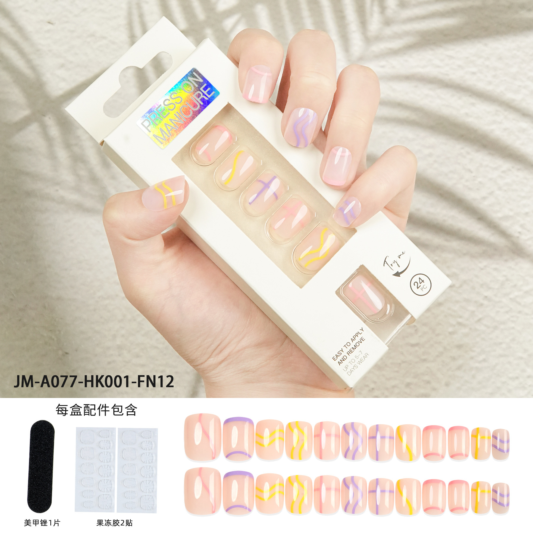 【Packing Method】24 pieces of nails + 2 pieces of backing tape + 1 grinding file Single box size: 14.5*5.3*2CM Single box weight: 25g
