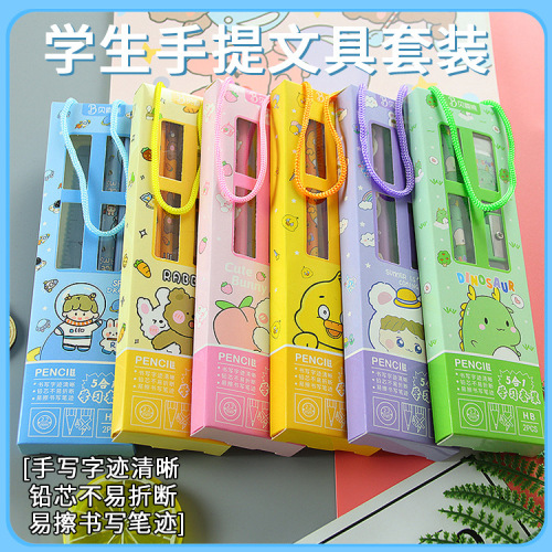 | ProductMaterial:Wooden Pencils 2 pieces,Pencil sharpener 1 piece,Eraser 1 piece,Cartoon Ruler 1 piece; | |