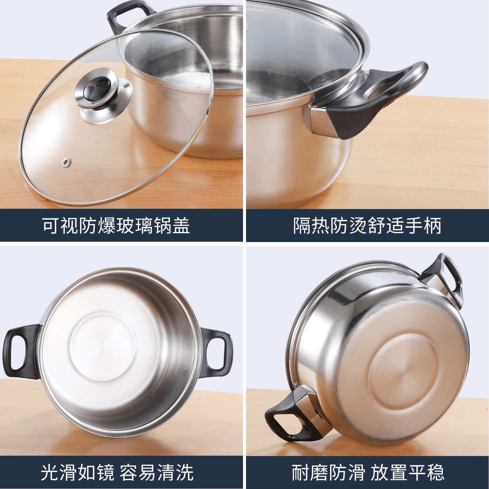 The pot body is 0.3mm thick and made of 410 stainless steel. The total weight of the set is 3100g.