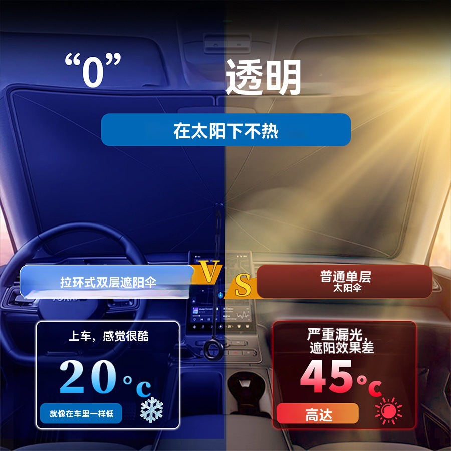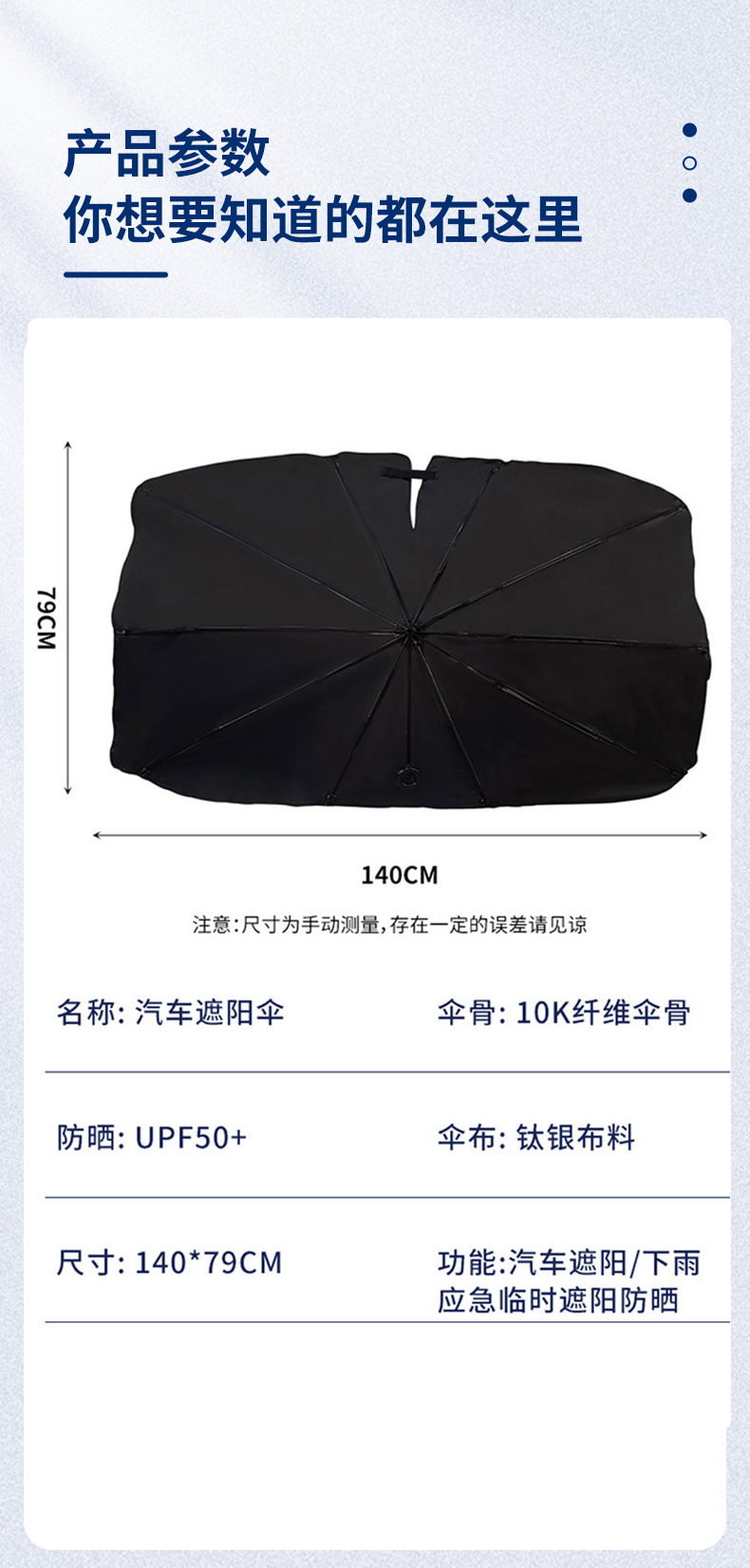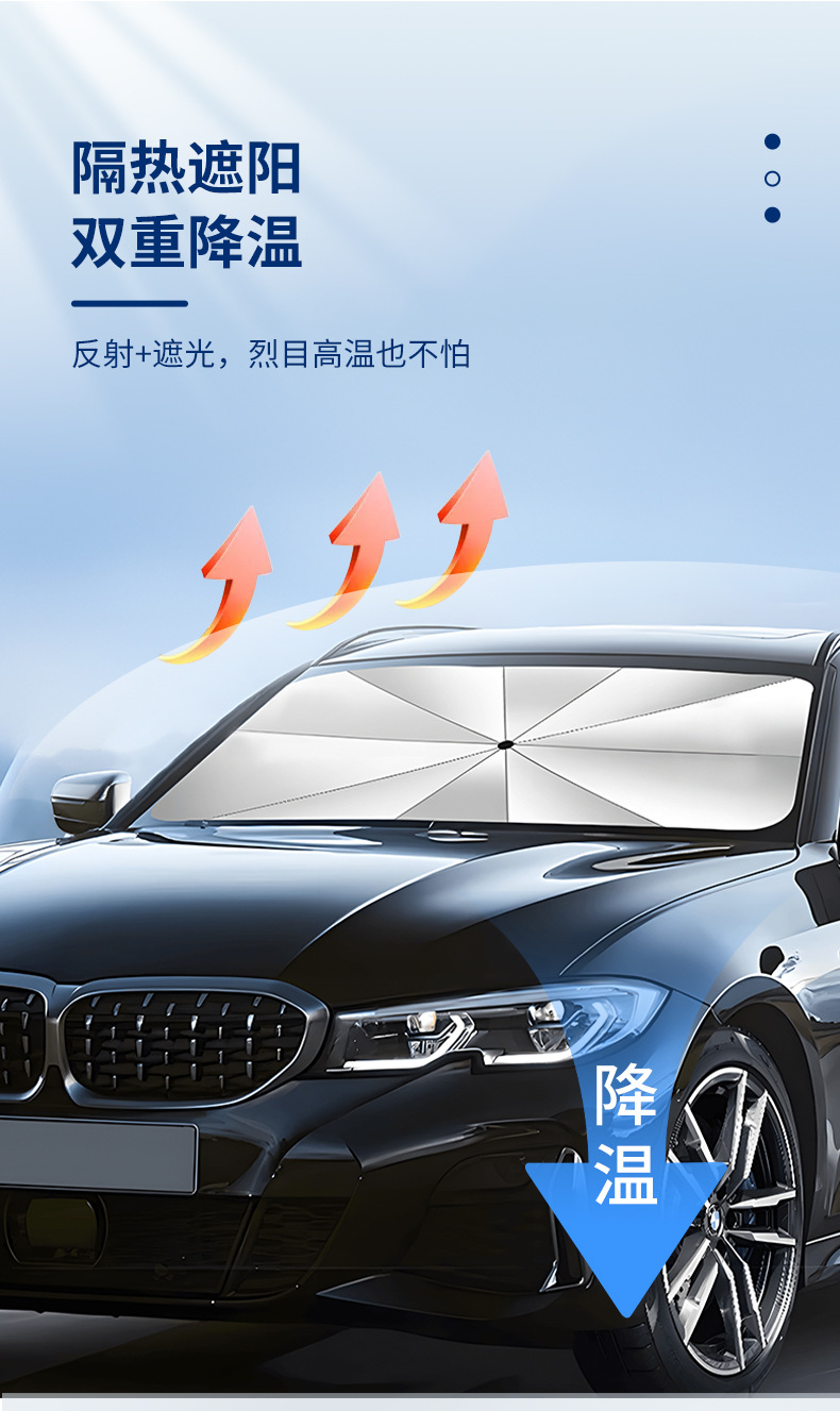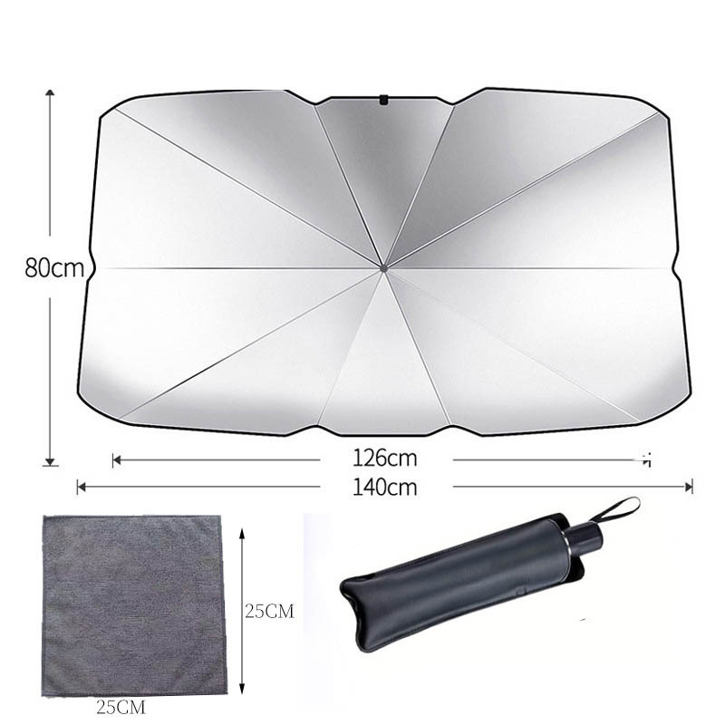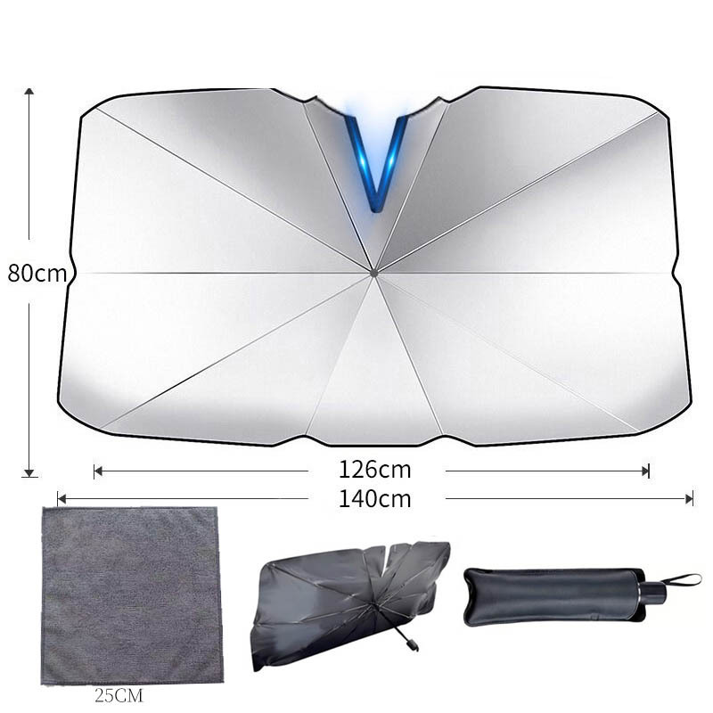【Selection Tips】: Umbrellas are more suitable for standard vehicles; Large size 140*80cm, small size 125*65cm. Standard three-box five-seat sedan models and compact SUV models are recommended to choose the large size, while the small size is suitable for two-box two-seat mini models.