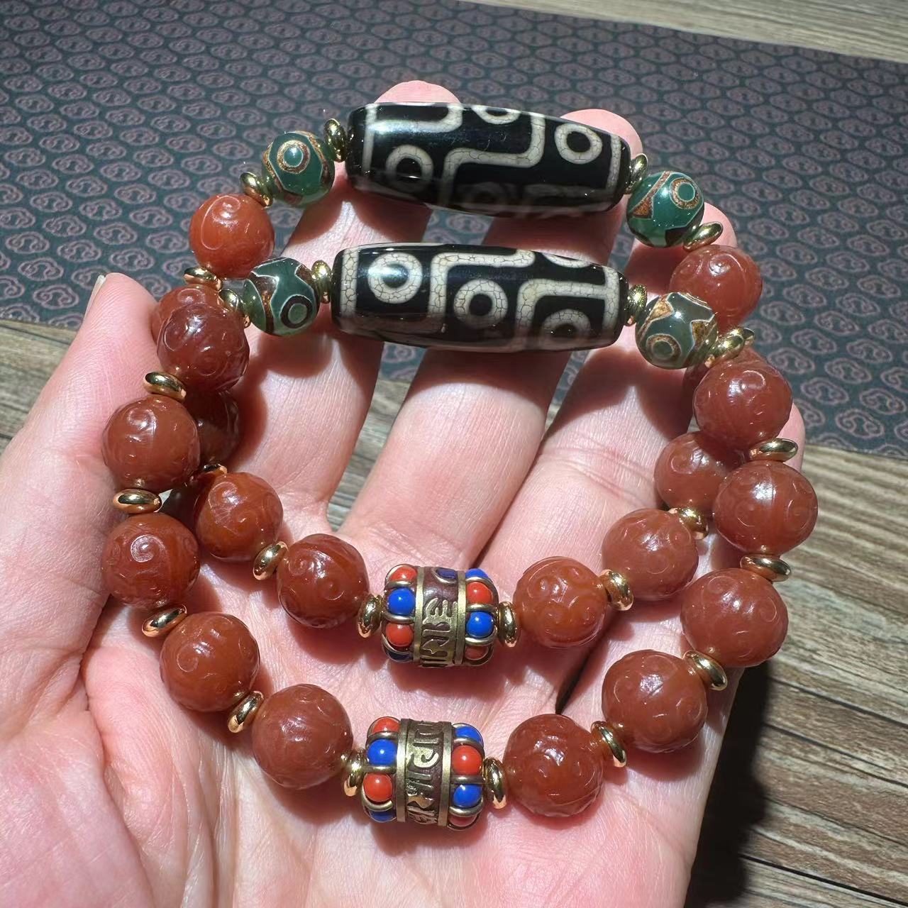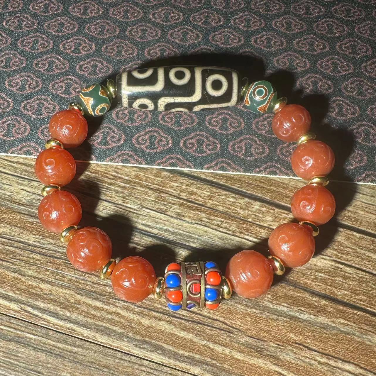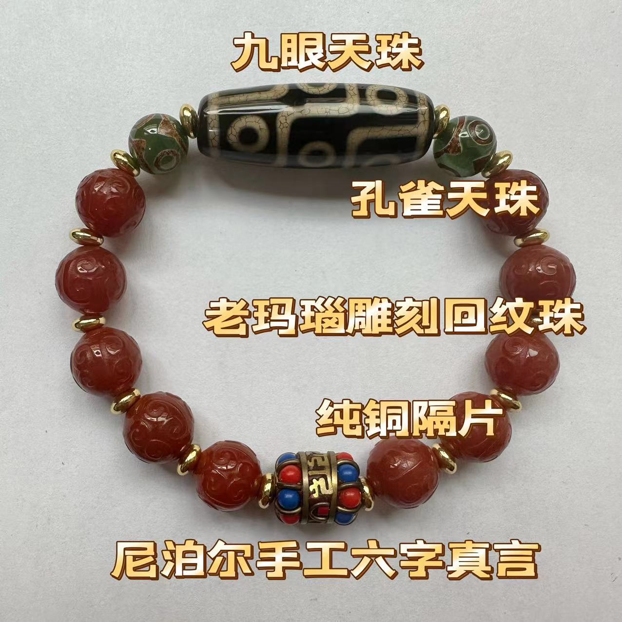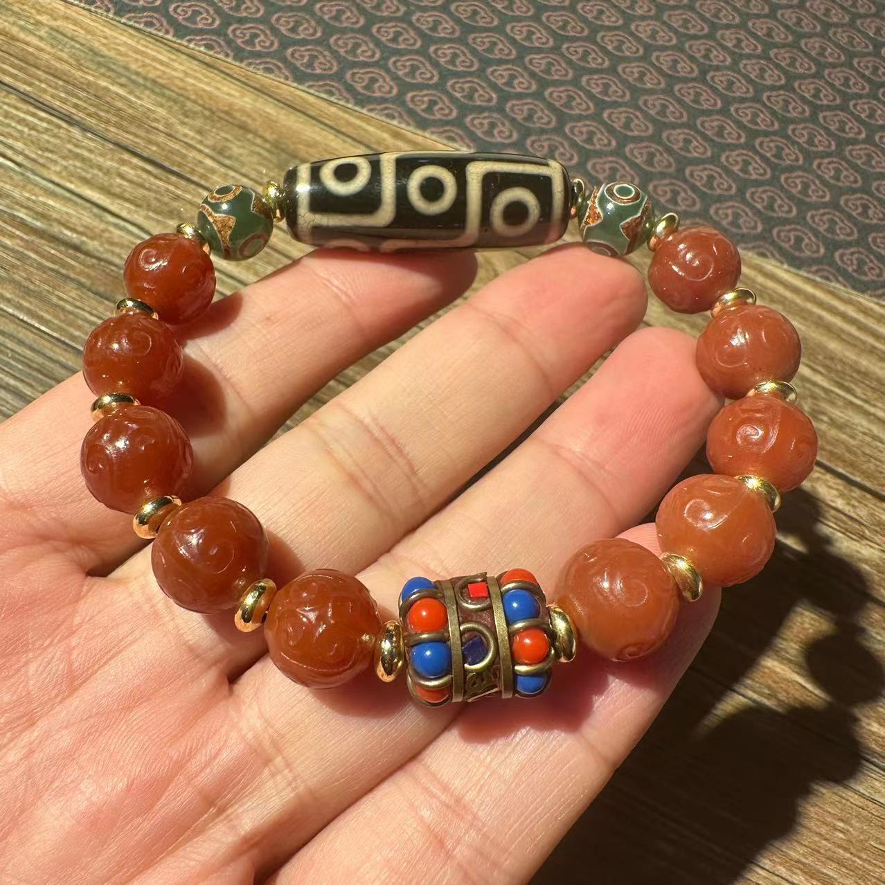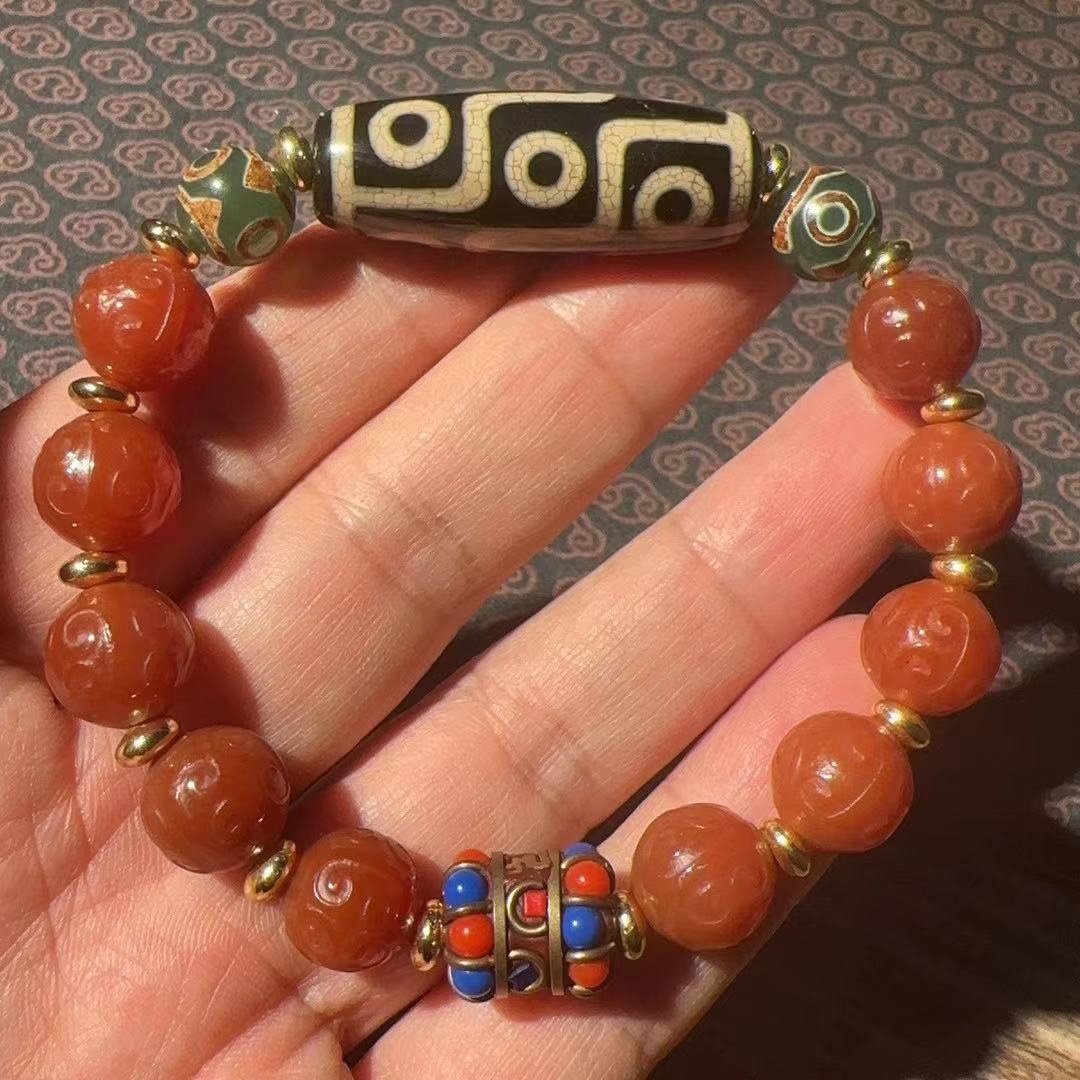 12mm old agate carving fret beads plus tibet beads bracelet