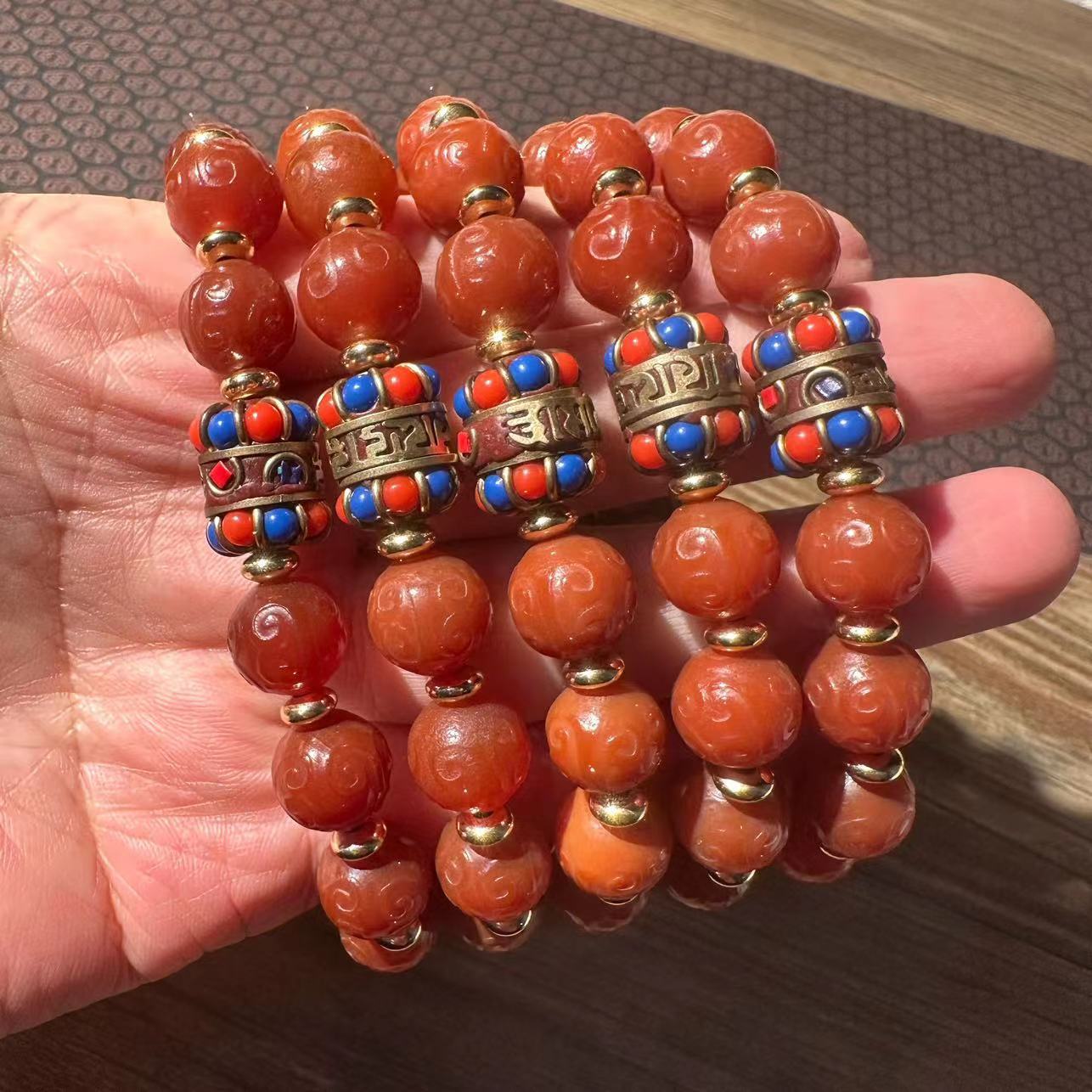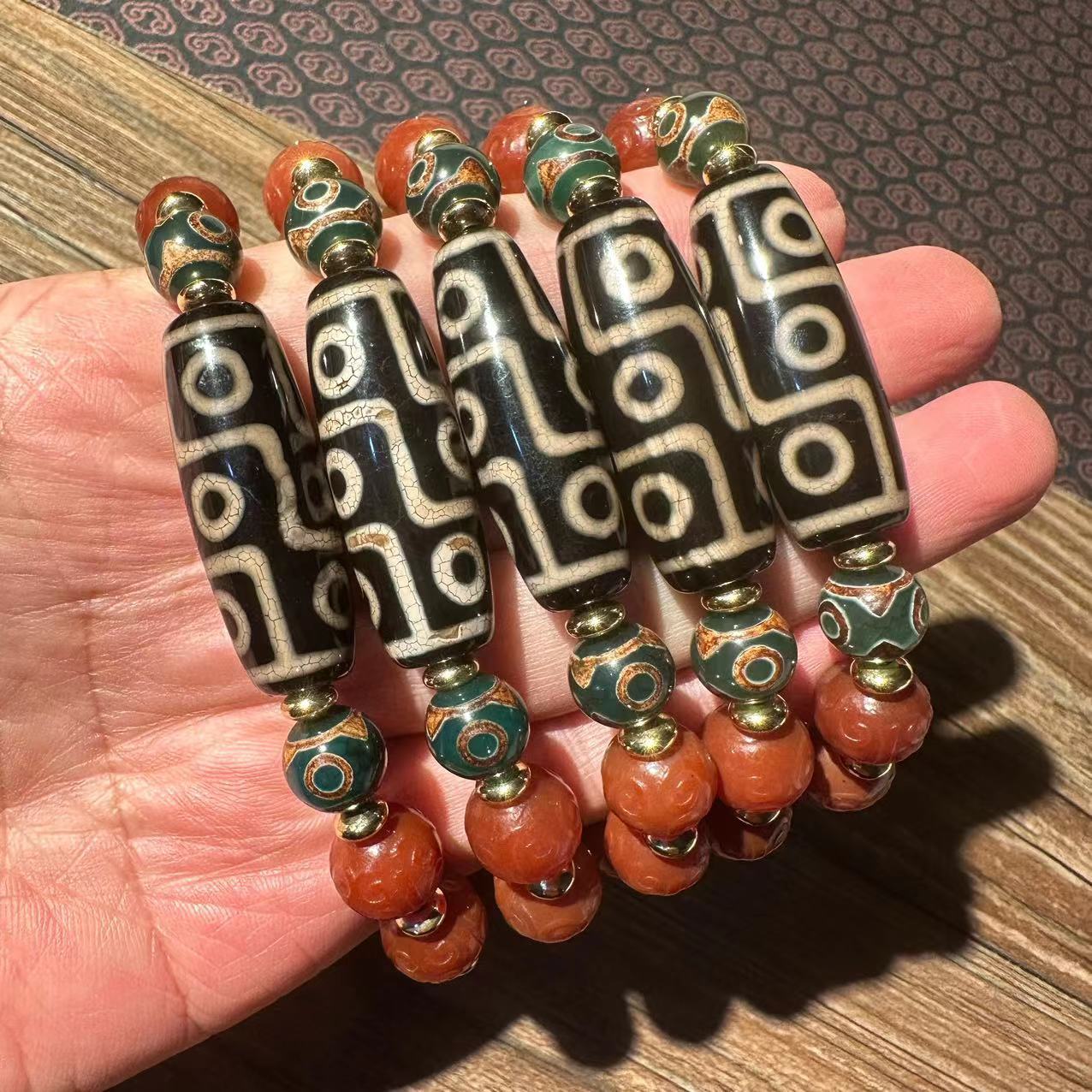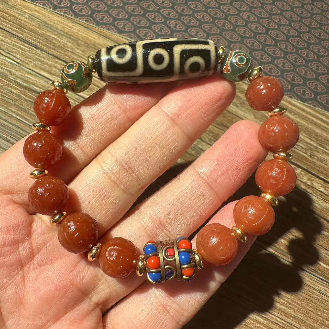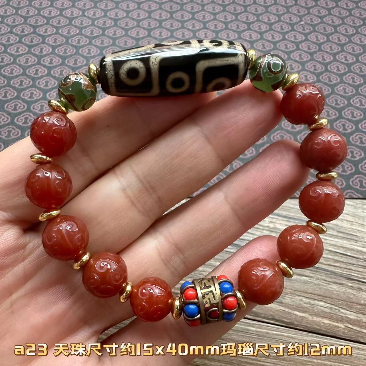 12mm old agate carving fret beads plus tibet beads bracelet