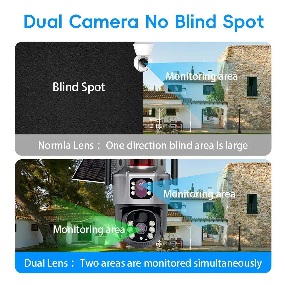 *双区域监控:多镜头子弹头-圆顶组合扩大了监视范围,通过比特流拼接实现统一观看 (vs.