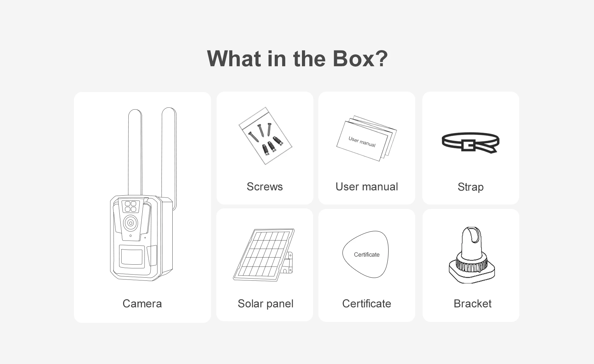 摄像机 * 1,支架 * 1,螺丝包装 * 1,手动 * 1,strao * 1 (可选: Type-C充电电缆 * 1,太阳能电池板 * 1,