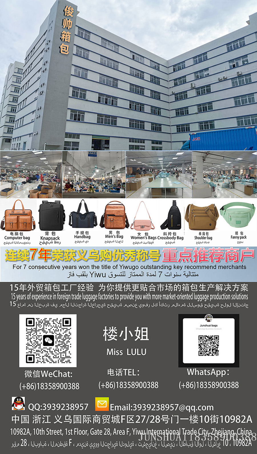 We have been dedicated to the production of luggage and bags for more than a decade, specializing in full-range products made from genuine leather, PU, PVC, nylon, oxford cloth, and canvas, including backpacks, shoulder bags, business men's bags, fashion women's bags, single-shoulder bags, school bags, travel bags, and large capacity luggage bags. We have over 3,000 stock items available, supporting 72-hour lightning delivery, and also provide deep customization services to meet different purchasing needs.