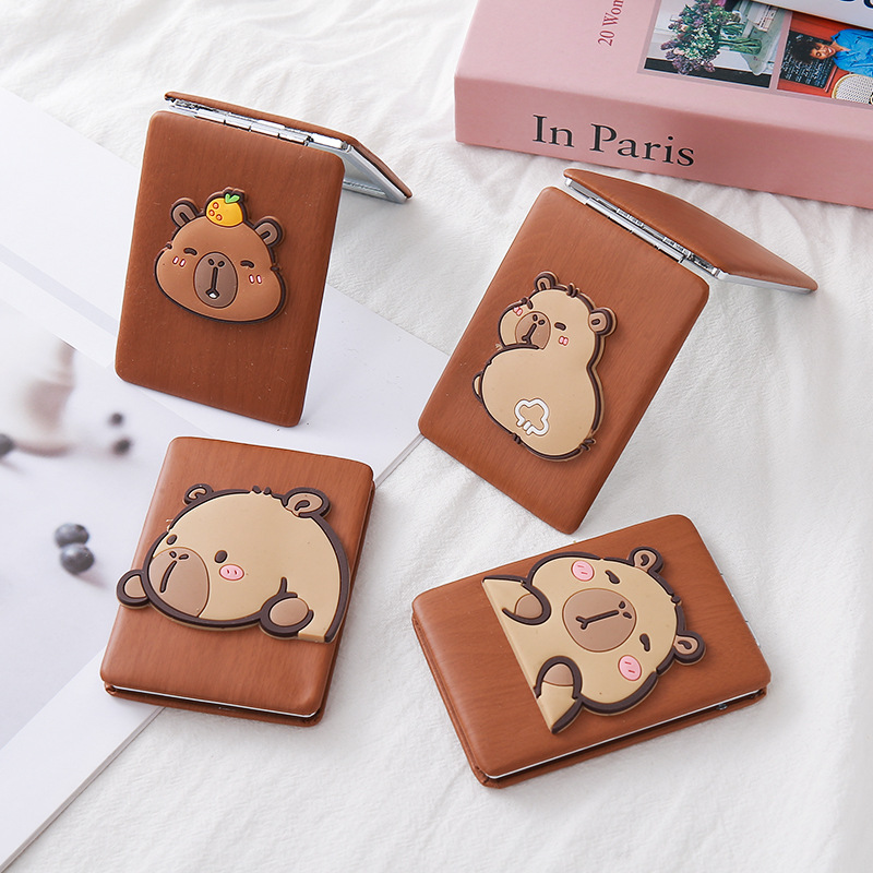 The new Kapibara wood grain folding mirror, with wood grain PU that stands out, is decorated with Kapibara soft rubber stickers, making it more beautiful. It measures approximately 8.8 cm in length, 6.2 cm in width, and 1 cm in height.