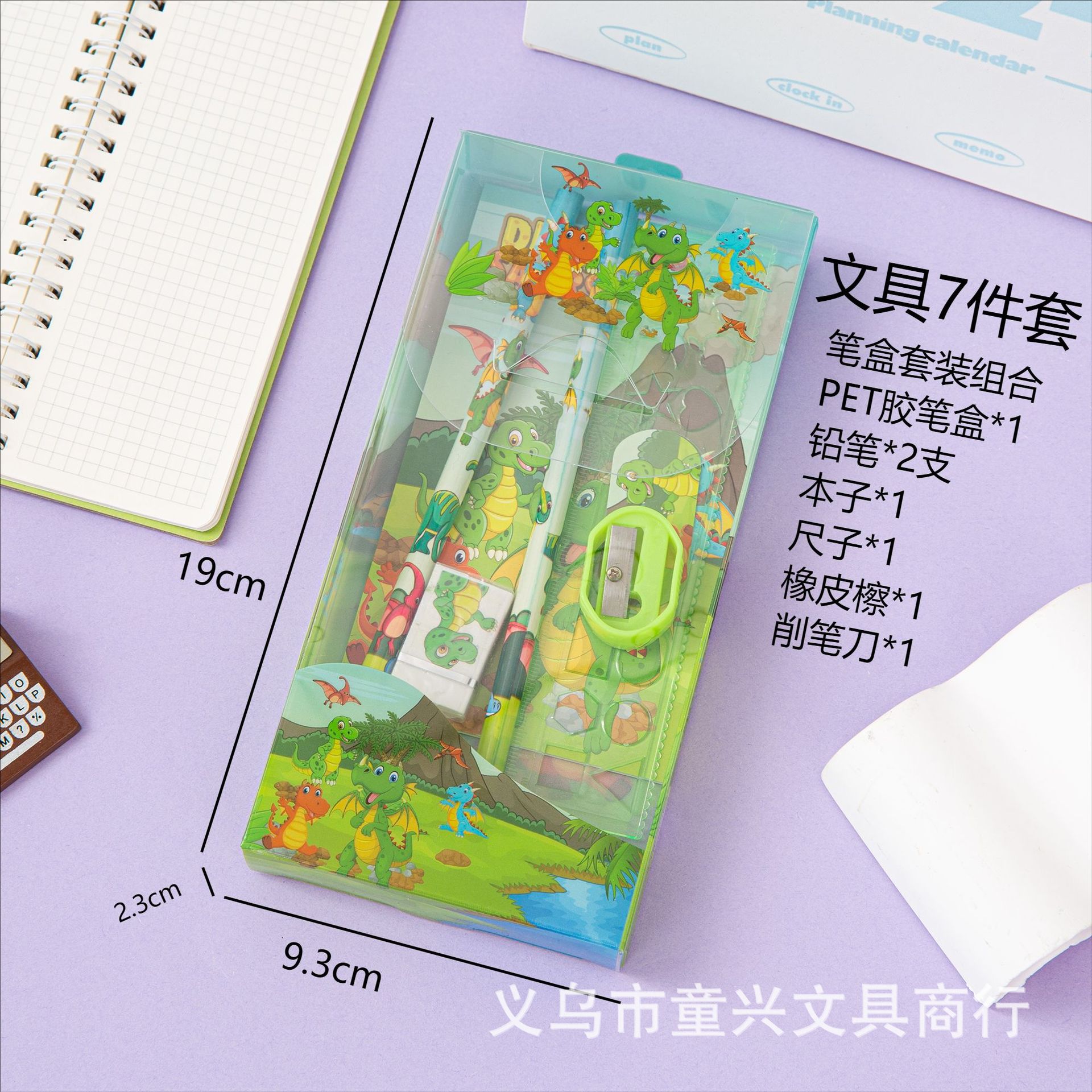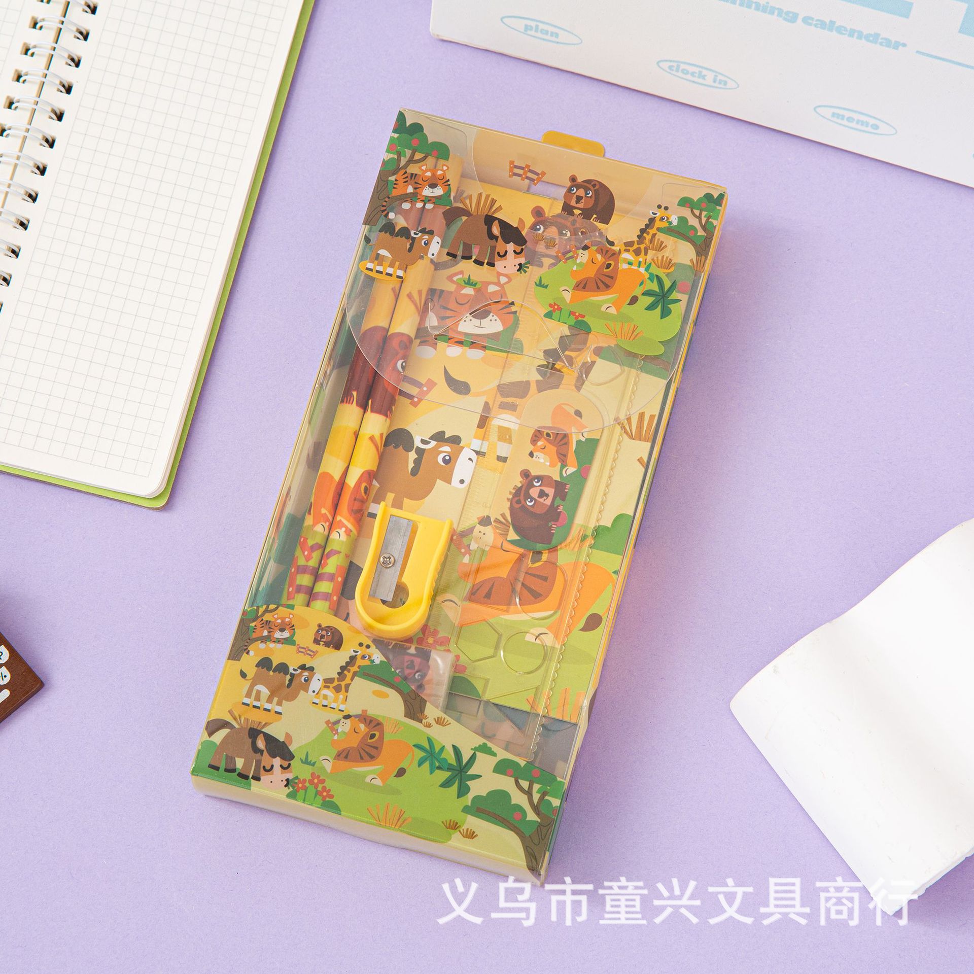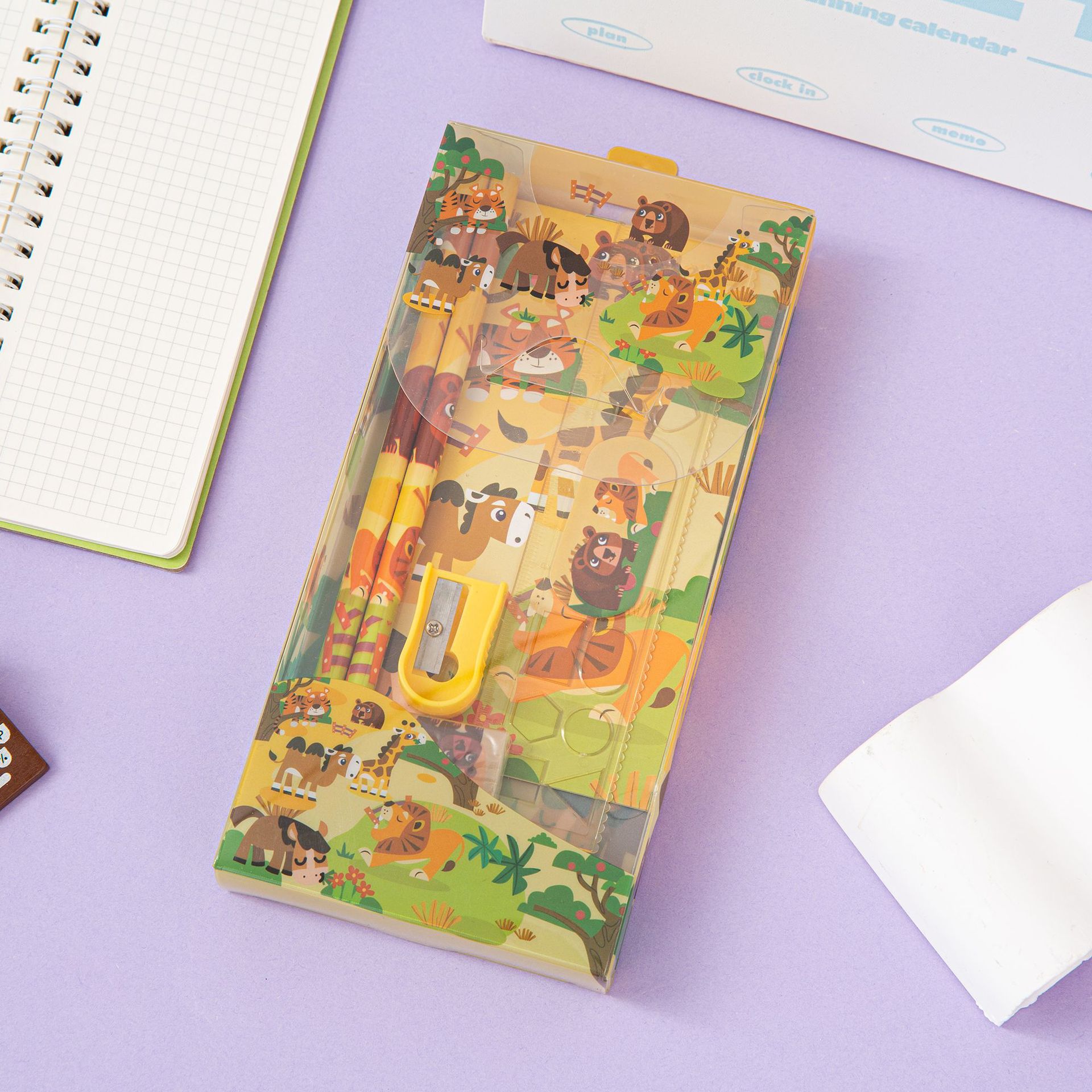 Set Combo: PET plastic pen case, 15cm ruler, 2 pencils, pencil sharpener, eraser, notebook