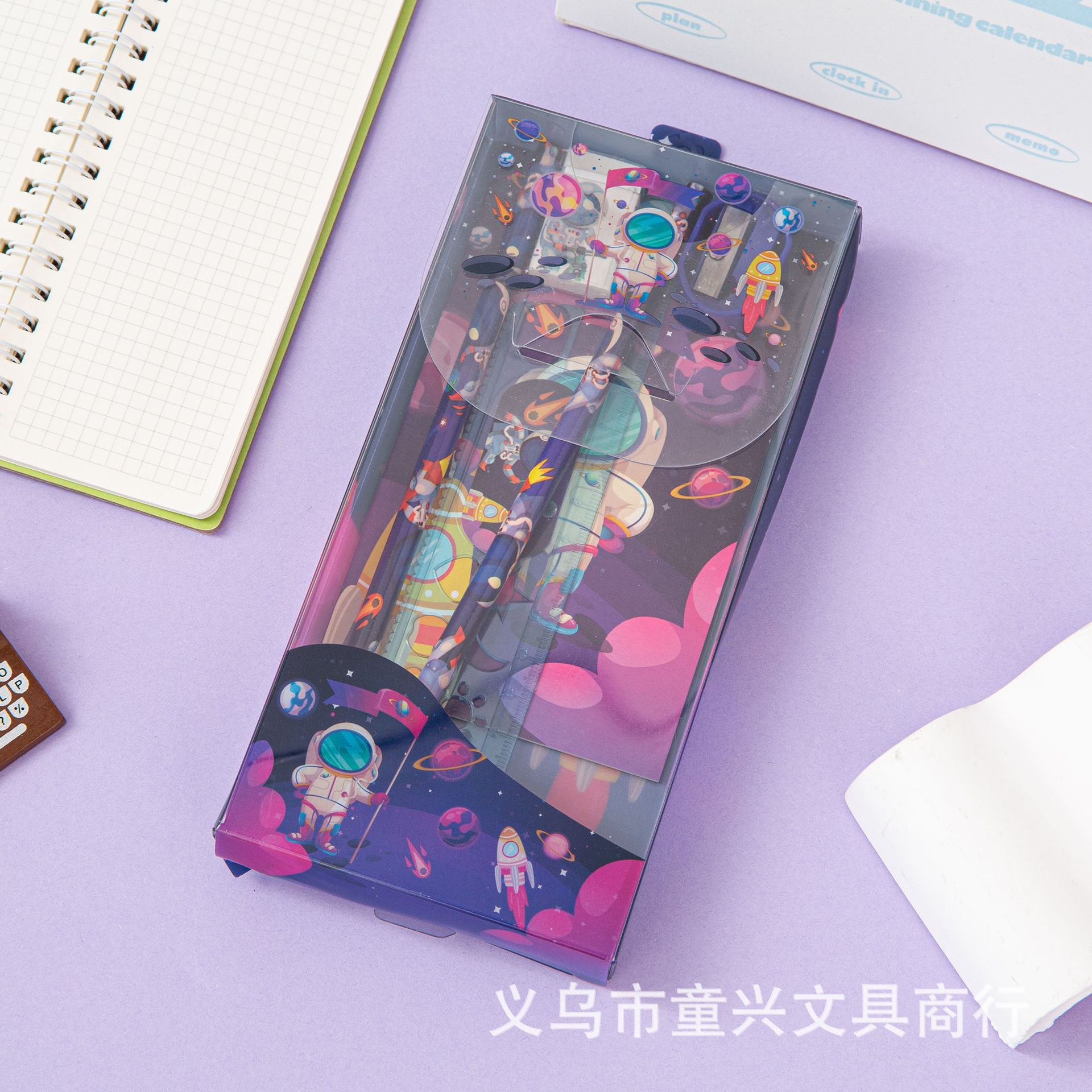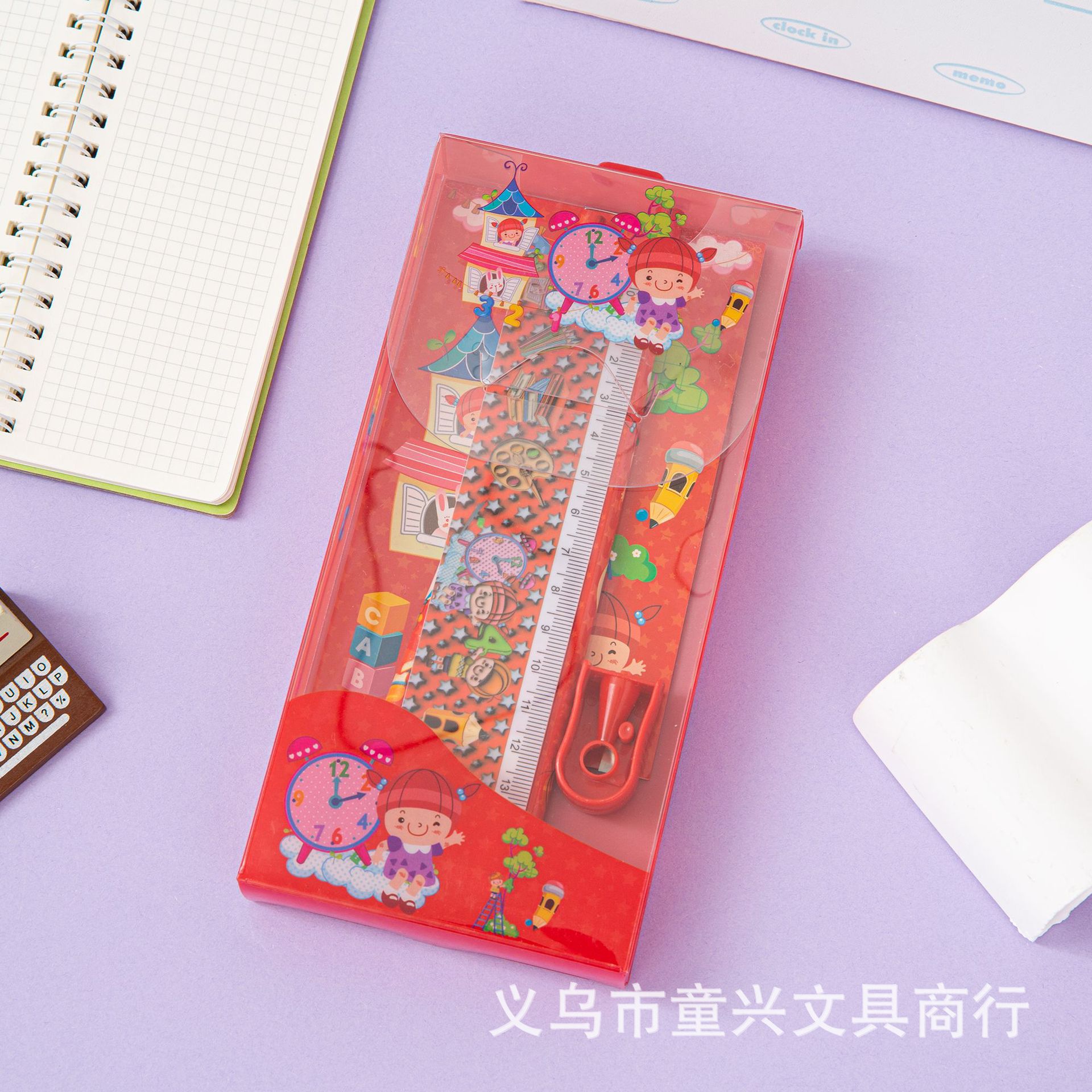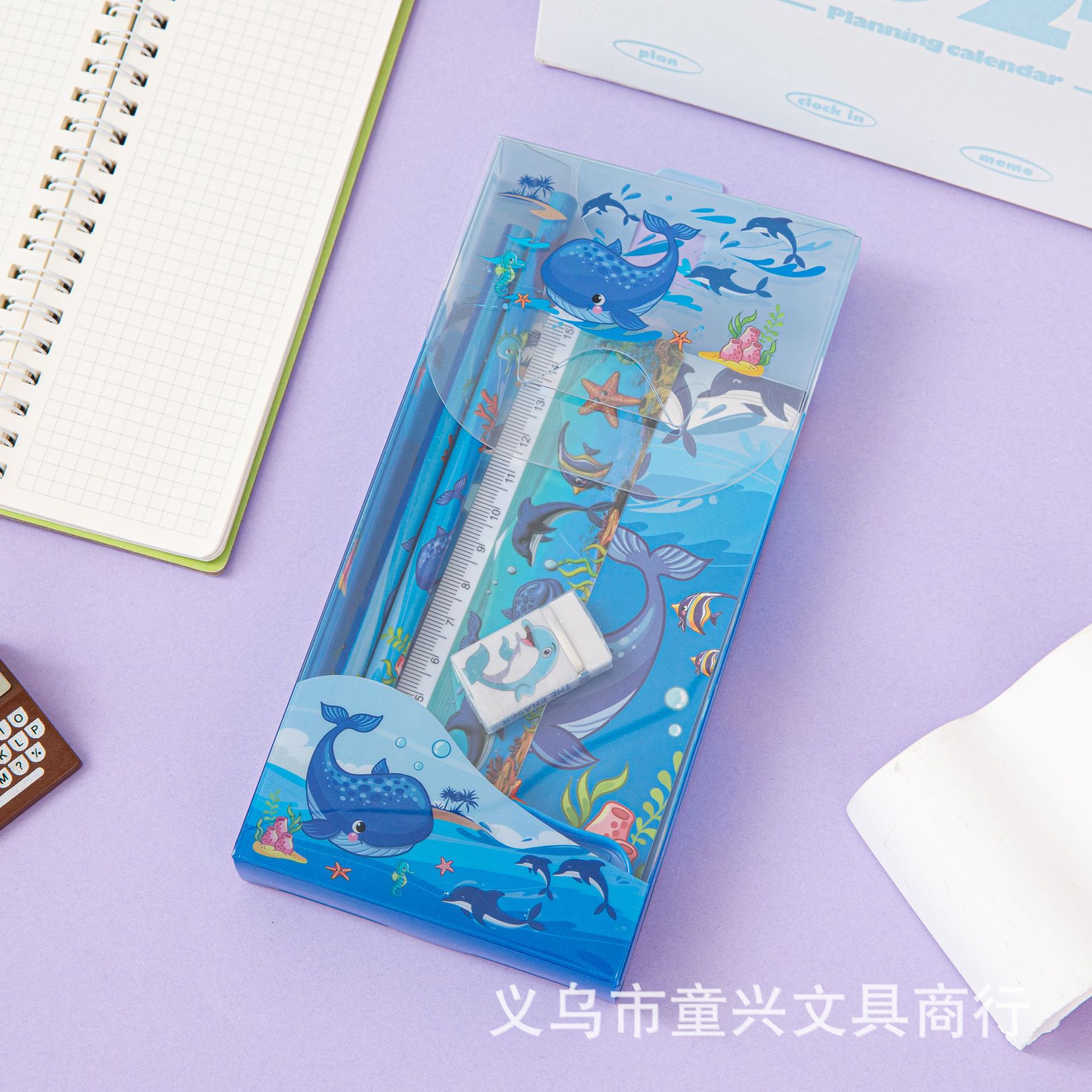 Set Combo: PET plastic pen case, 15cm ruler, 2 pencils, pencil sharpener, eraser, notebook