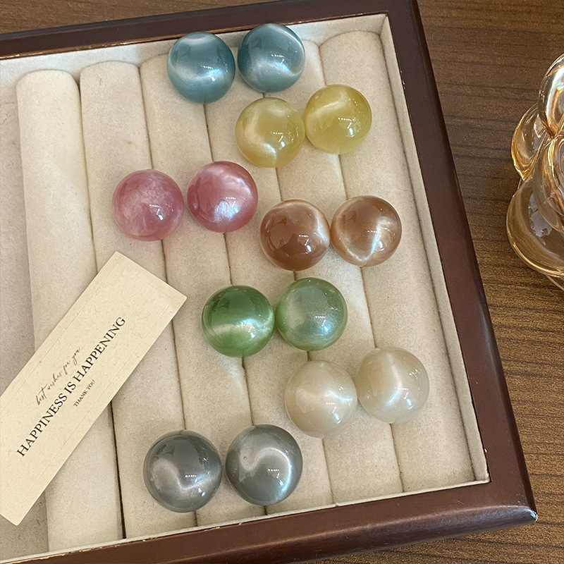 925 silver needle-khaki ball cat eye stud earrings (aa1450)