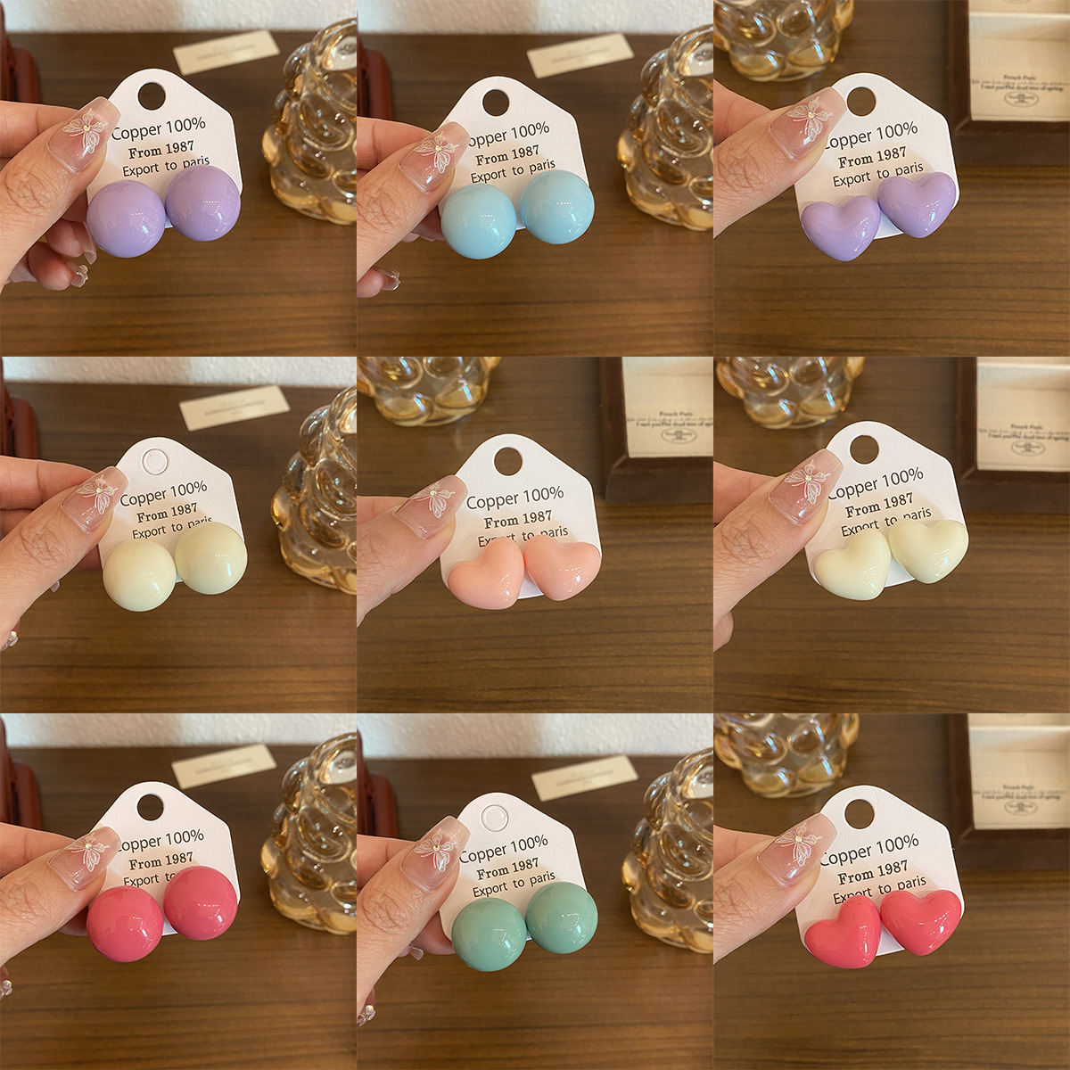 925 silver needle -- purple heart-shaped gold foil stud earrings (aa3558)