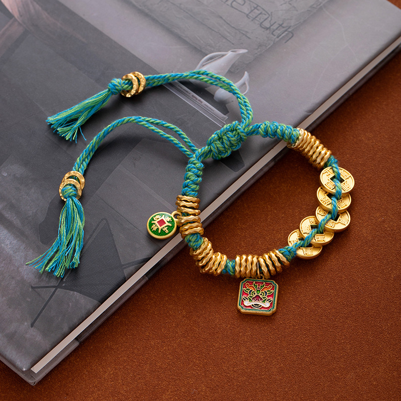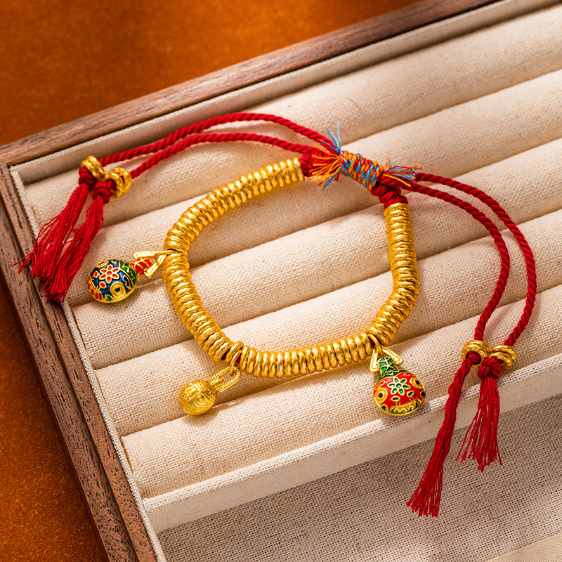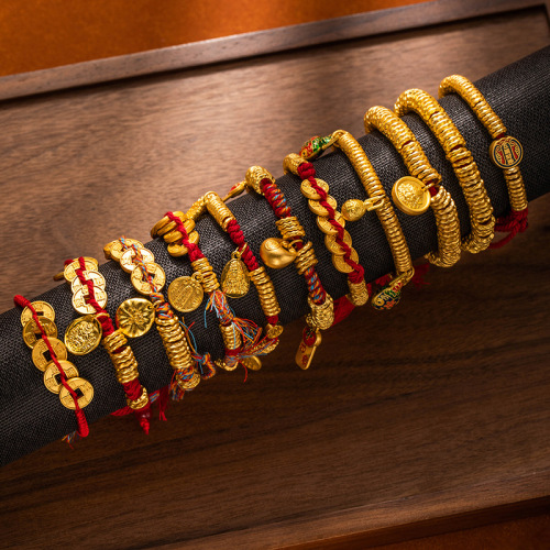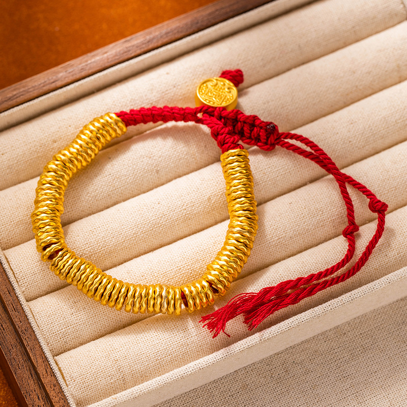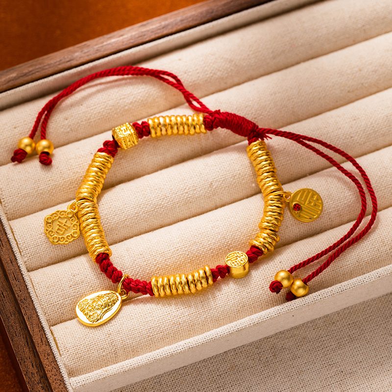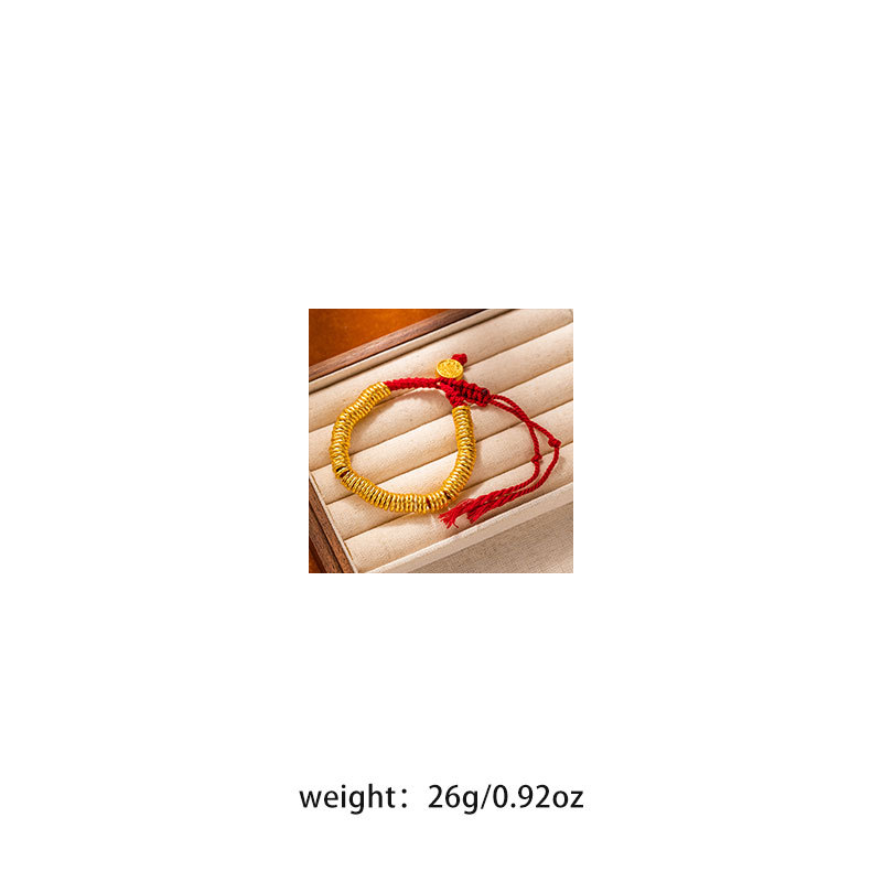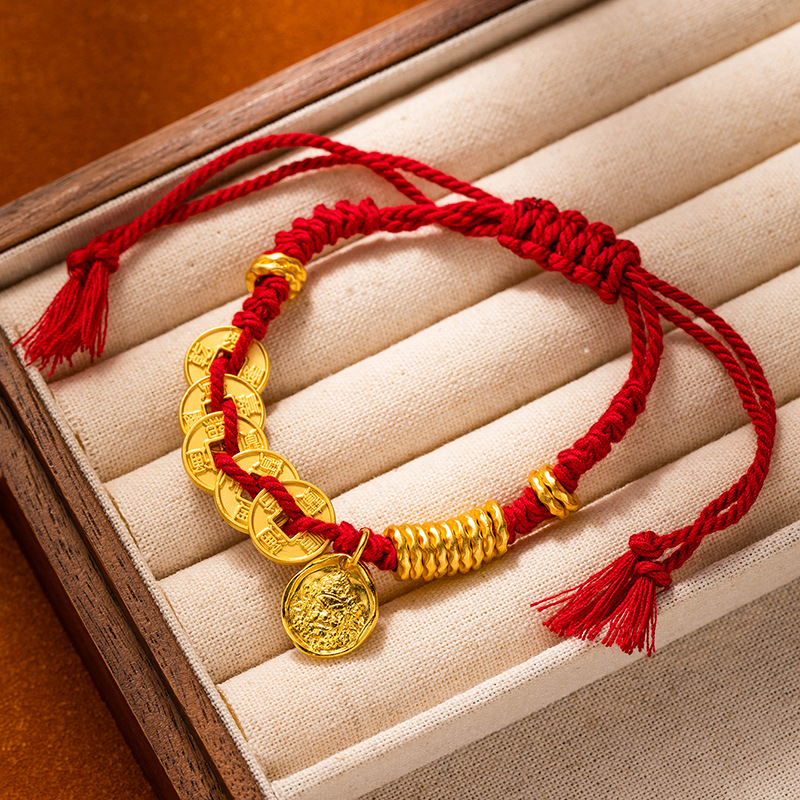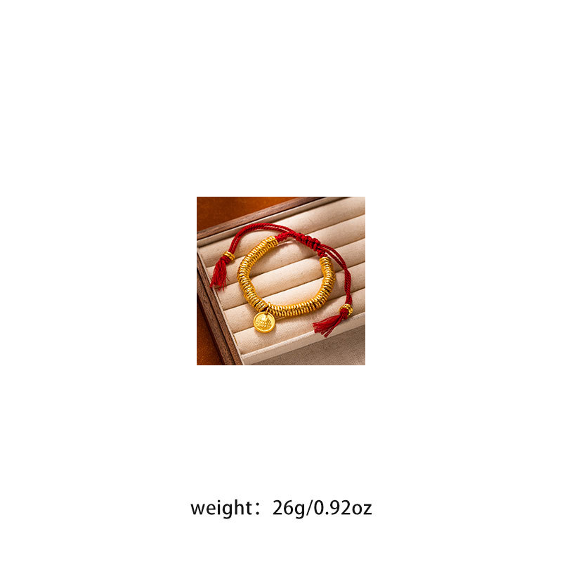 New Chinese-style traditional gold bracelet with golden yellow Fortune God round badge and red rope bracelet for men and women, wholesale supply of wealth-wrapped wristbands