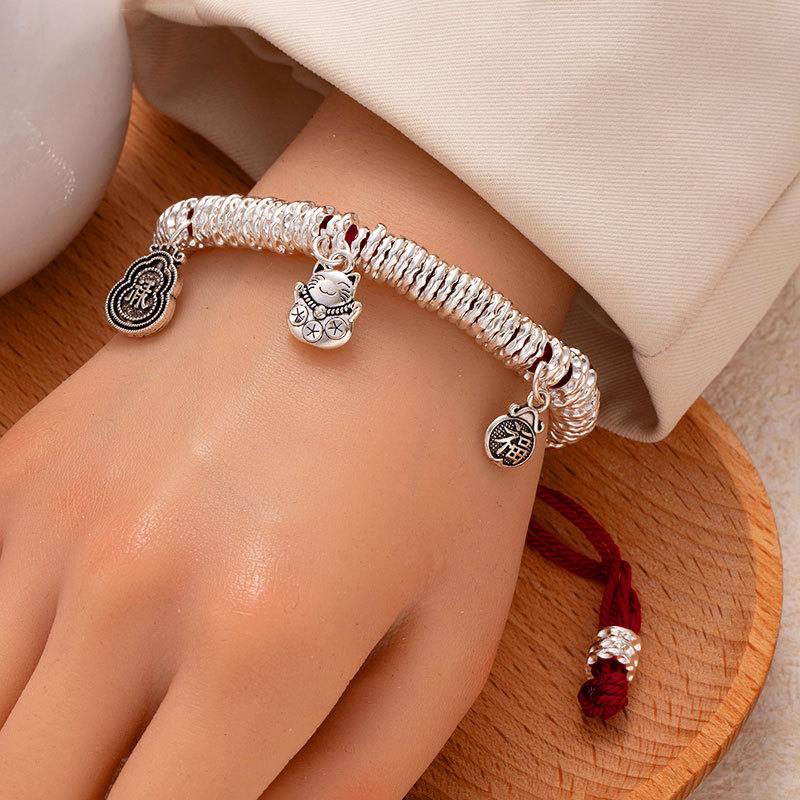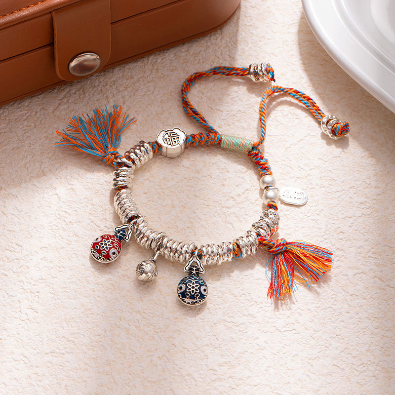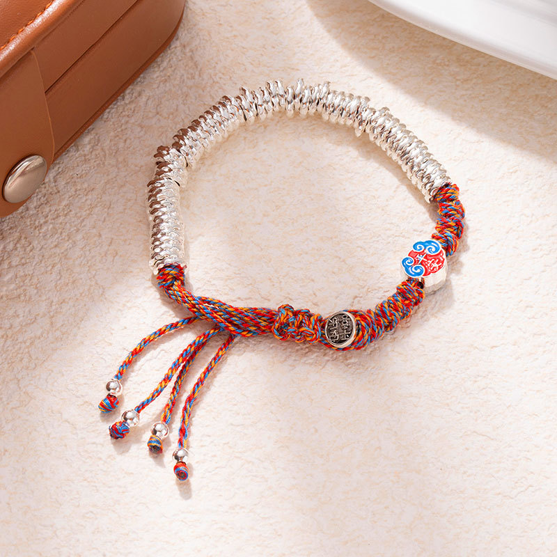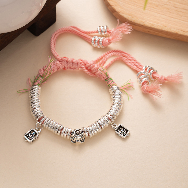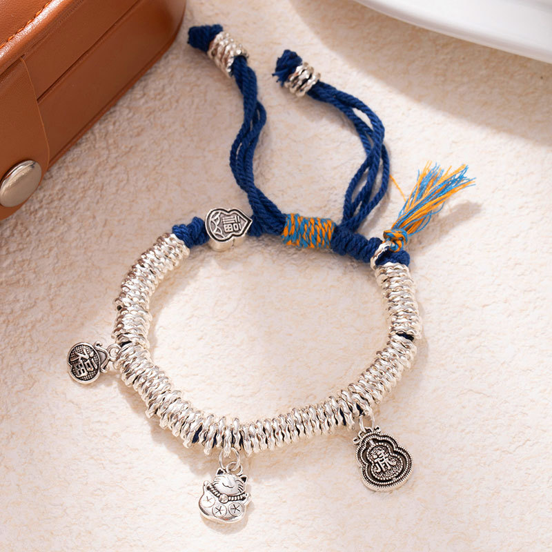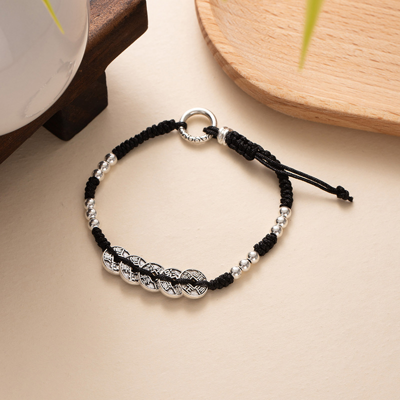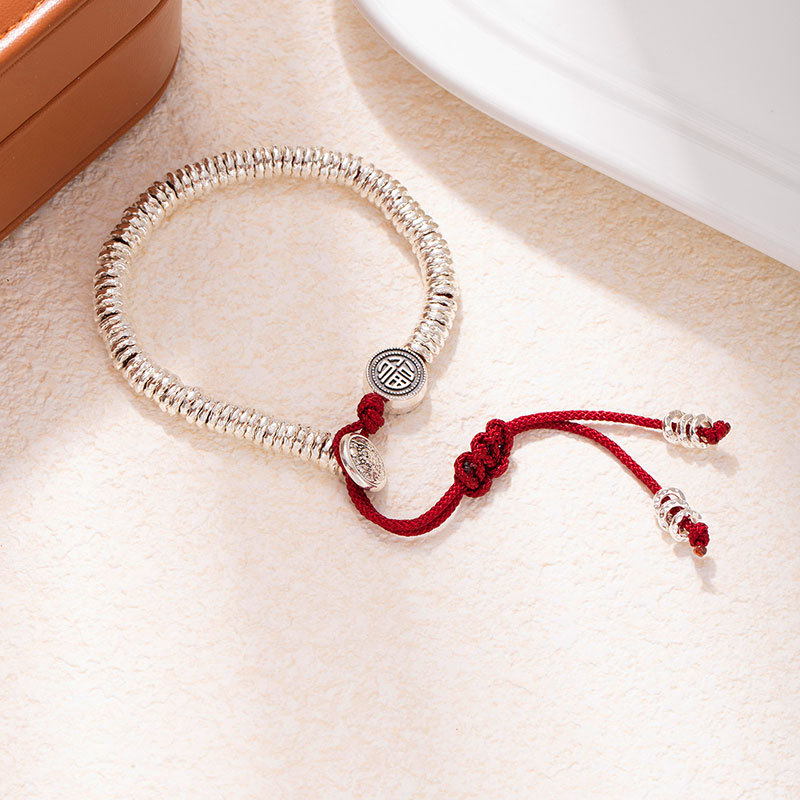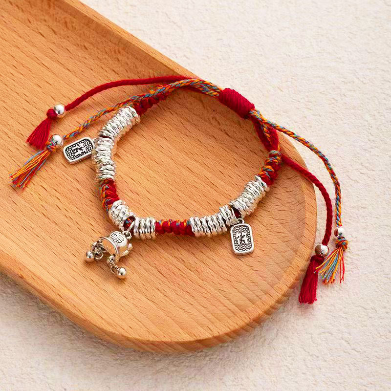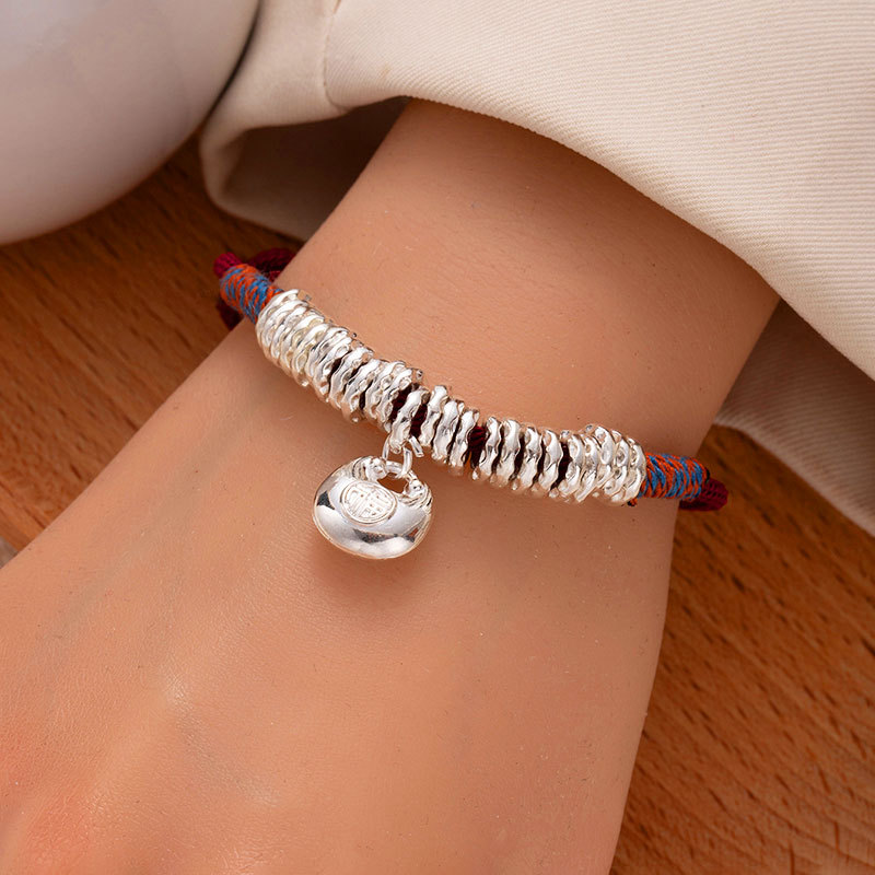 New Chinese-style silver beads bracelet with gold-like effect, handcrafted braided bracelet with adjustable length, safe and prosperous luck charm, trendy and cool fashion accessories, wholesale supply.