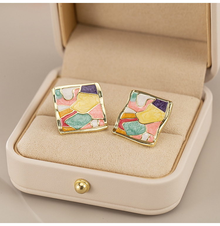 painless mosquito coil ear clip retro french colorful geometric square non-piercing earrings artistic oil painting style stud earrings for women 中文版