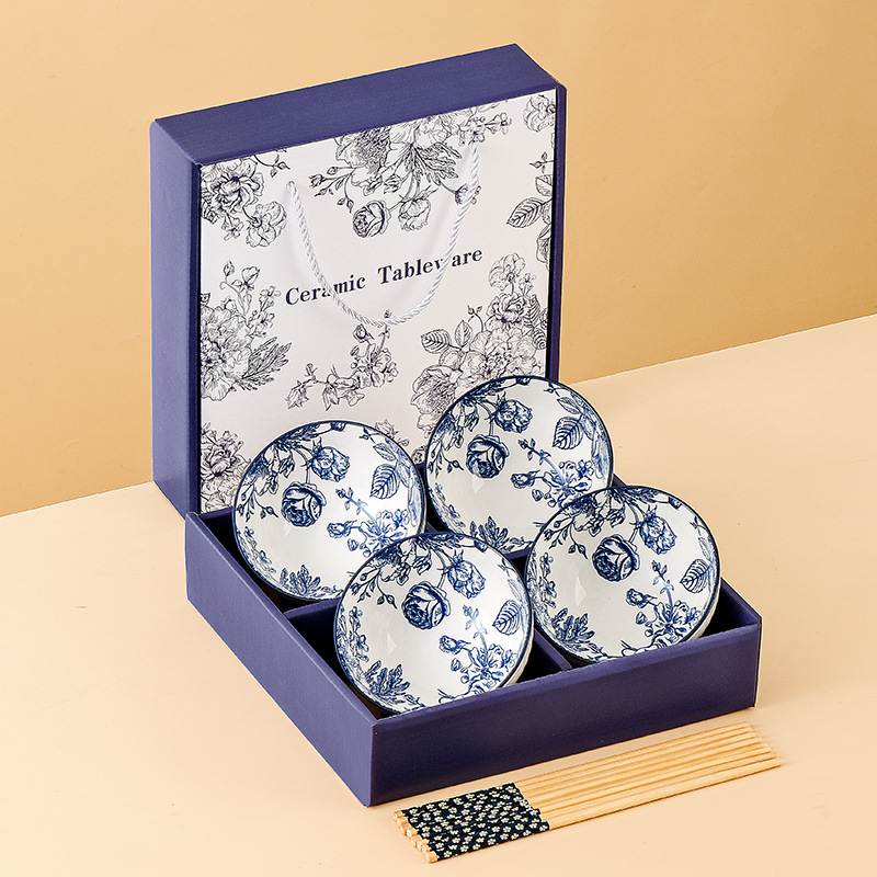 blue rose 4 bowls and chopsticks-gift box