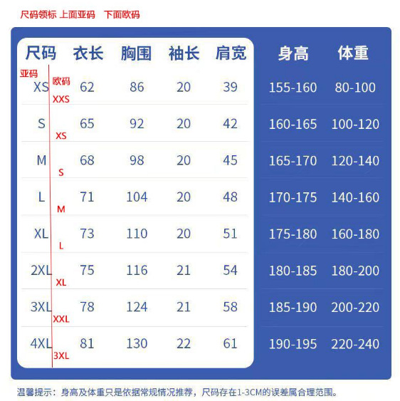Cotton Tone Printing Size Chart (Asia-Europe Size)