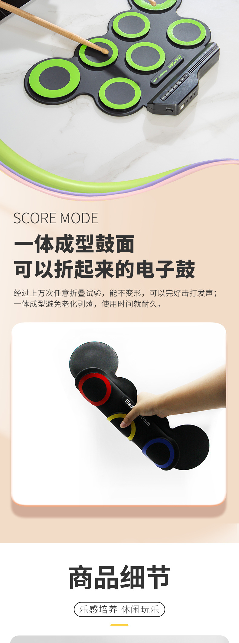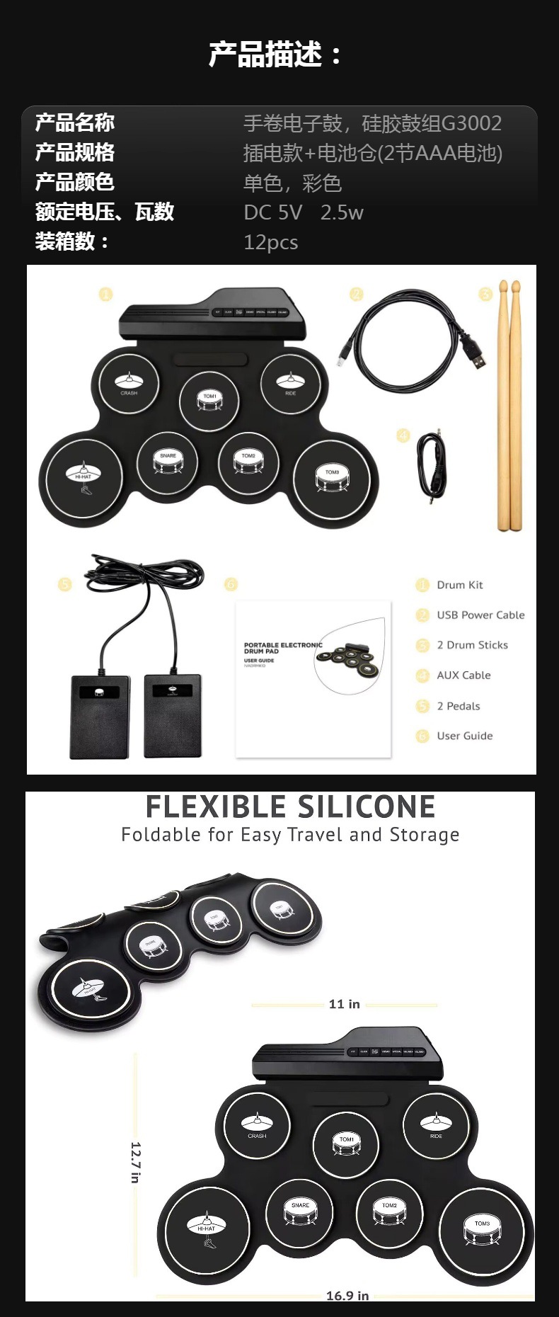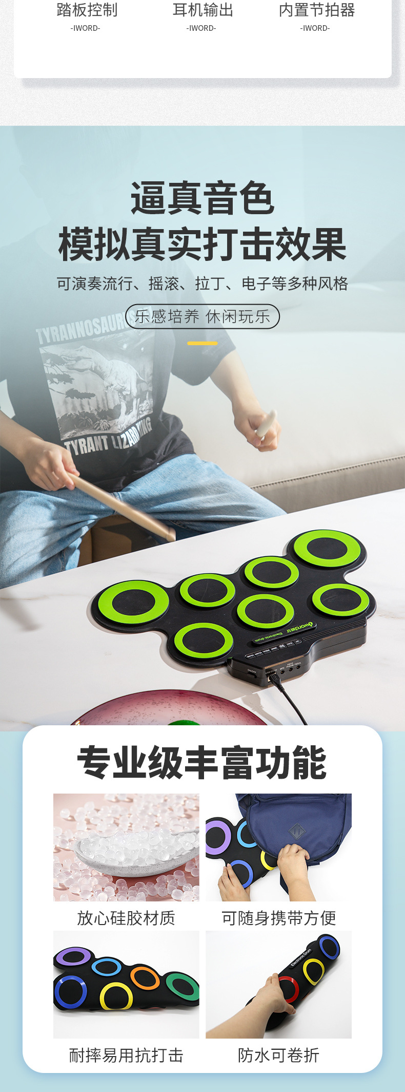 Compact size and portable roll-up electronic drum set, very convenient to carry and store.