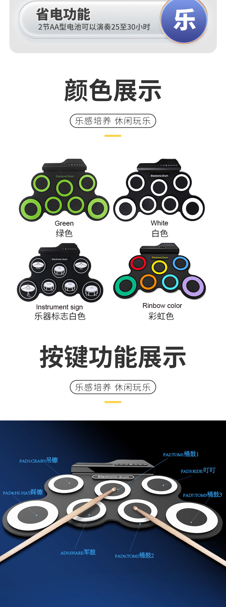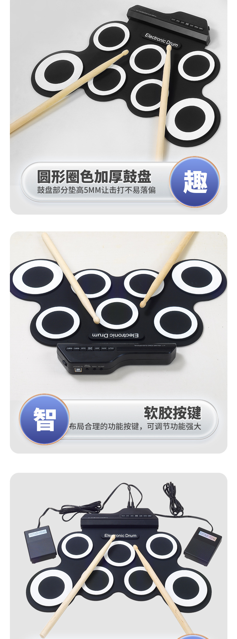 With 7 silicon drum pads including Tom/Snare/Hi-Hat/Crash/Ride, making excellent sounds and simulating real beating effect.