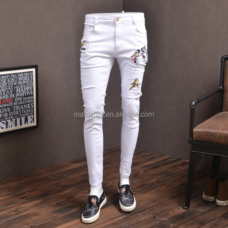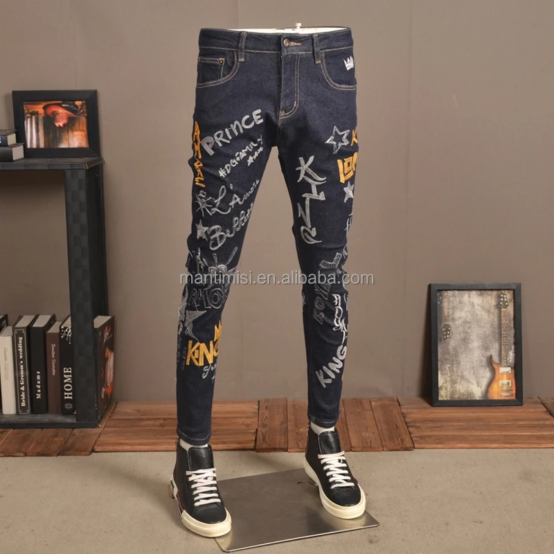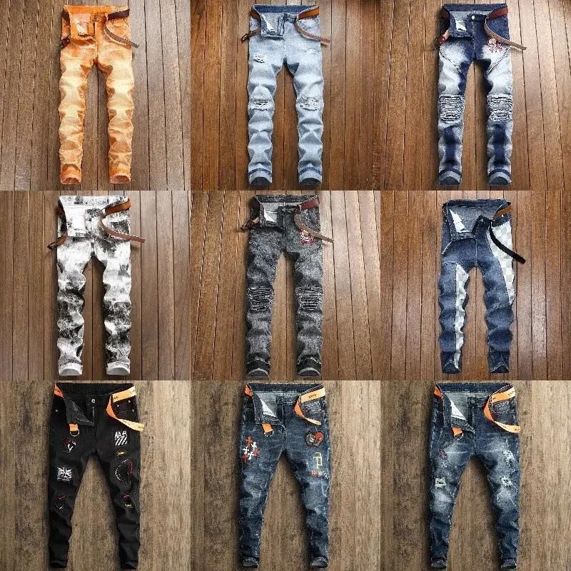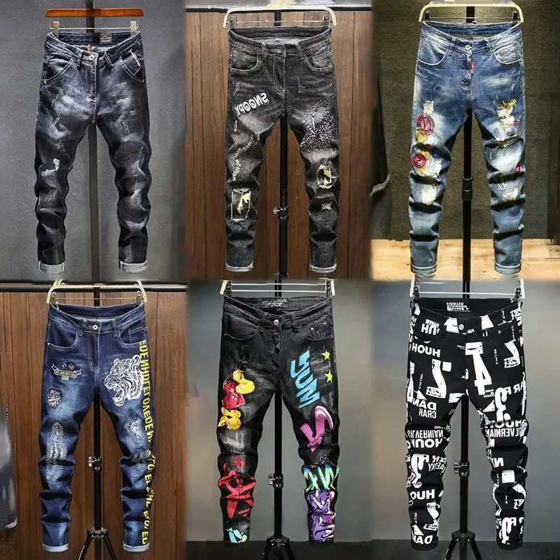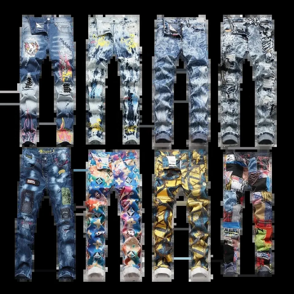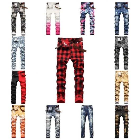 Mens Skinny Ripped Biker Slim Fit Jeans Fashion Printed Comfy Stretch Denim Jeans Pants