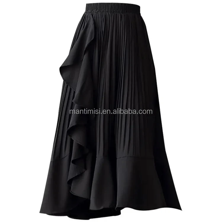 Womens a Line Long Midi Denim Skirt Tired Pleated Layers Elastic Waist Front Drawstring