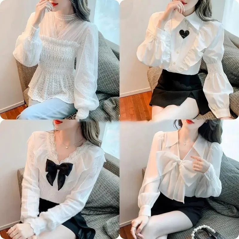 Women's White Chiffon Blouse Ruffle Long Sleeve V-Neck Business Casual Summer Tops Cute Shirt Lace Embroidery Feathers Button