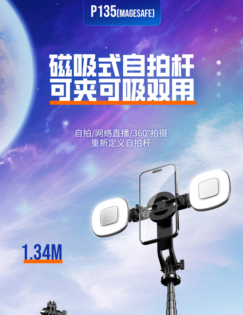 p135magsafe magnetic selfie stick/black double light