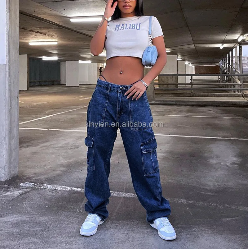 Europe and the United States Foreign Trade Women High Waist Elastic Waist Head Sagging Pants Loose Wide Leg Cargo Multibag Jeans