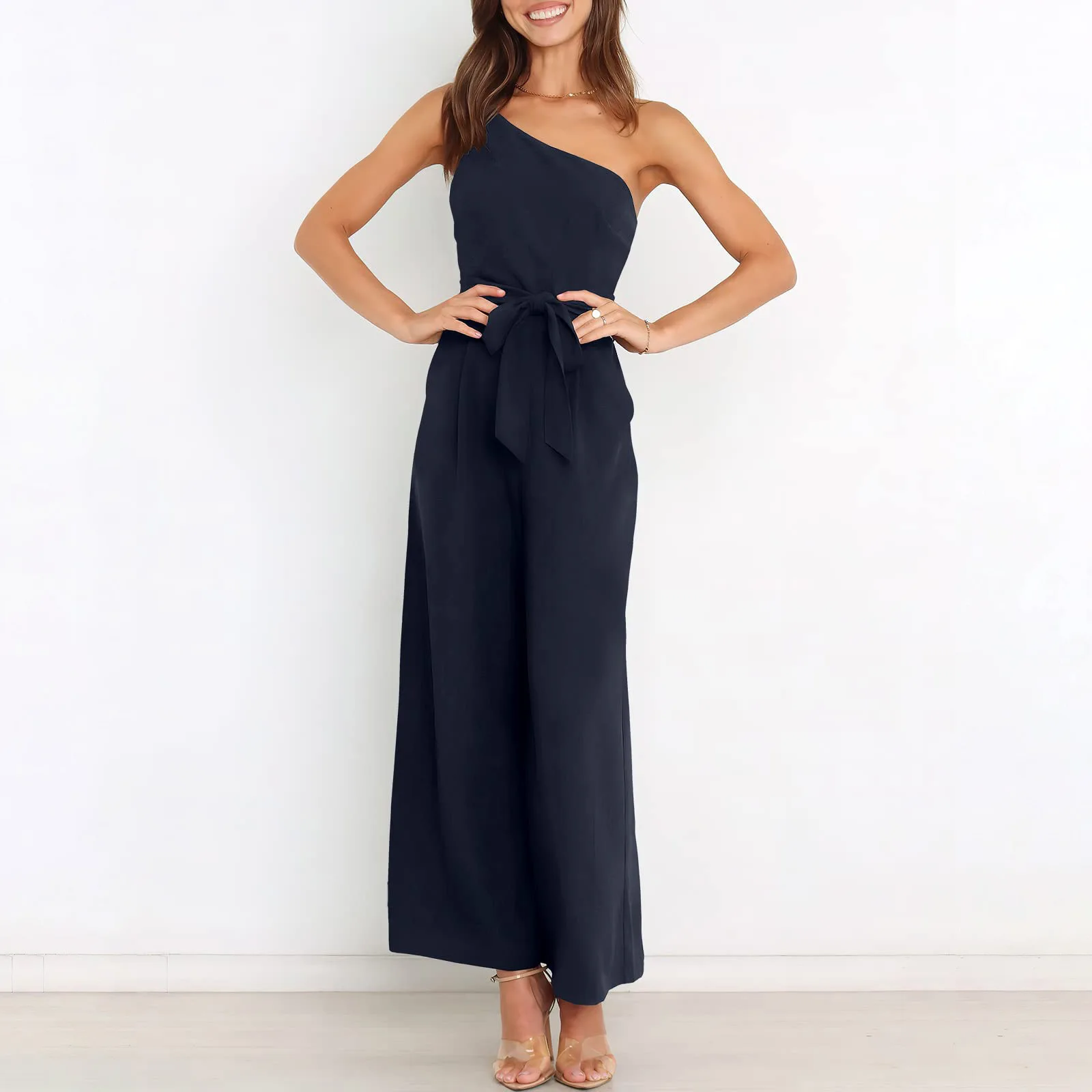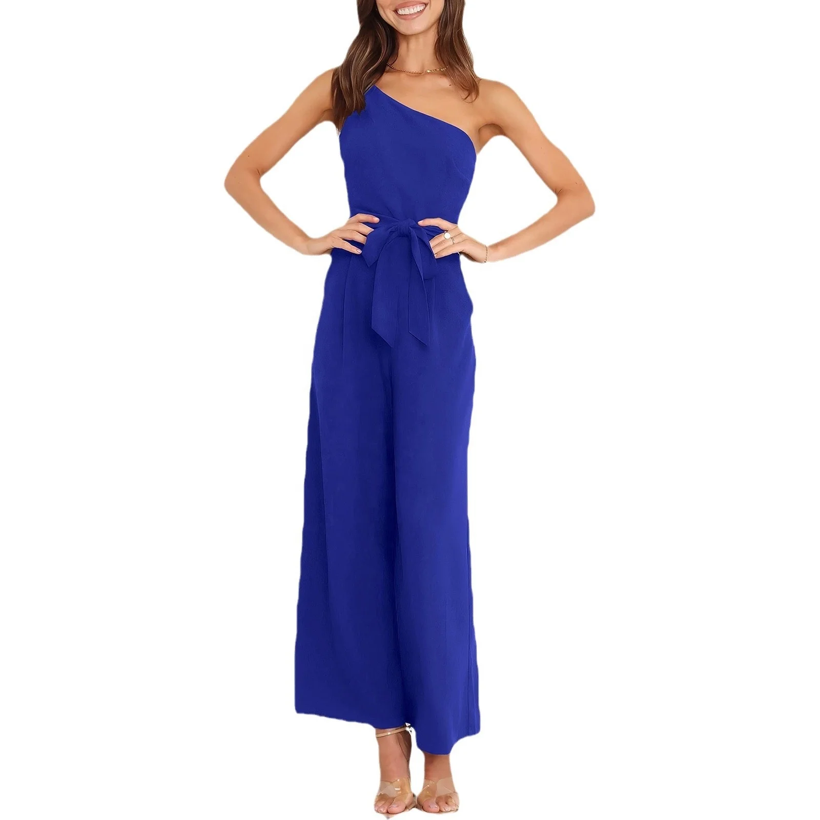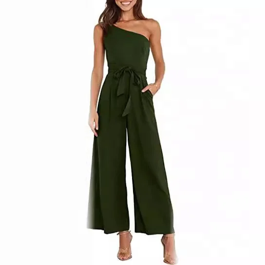 Women's Summer Casual Jumpsuits Ruffle One Shoulder One Piece Belted Long Pants Rompers With Pockets